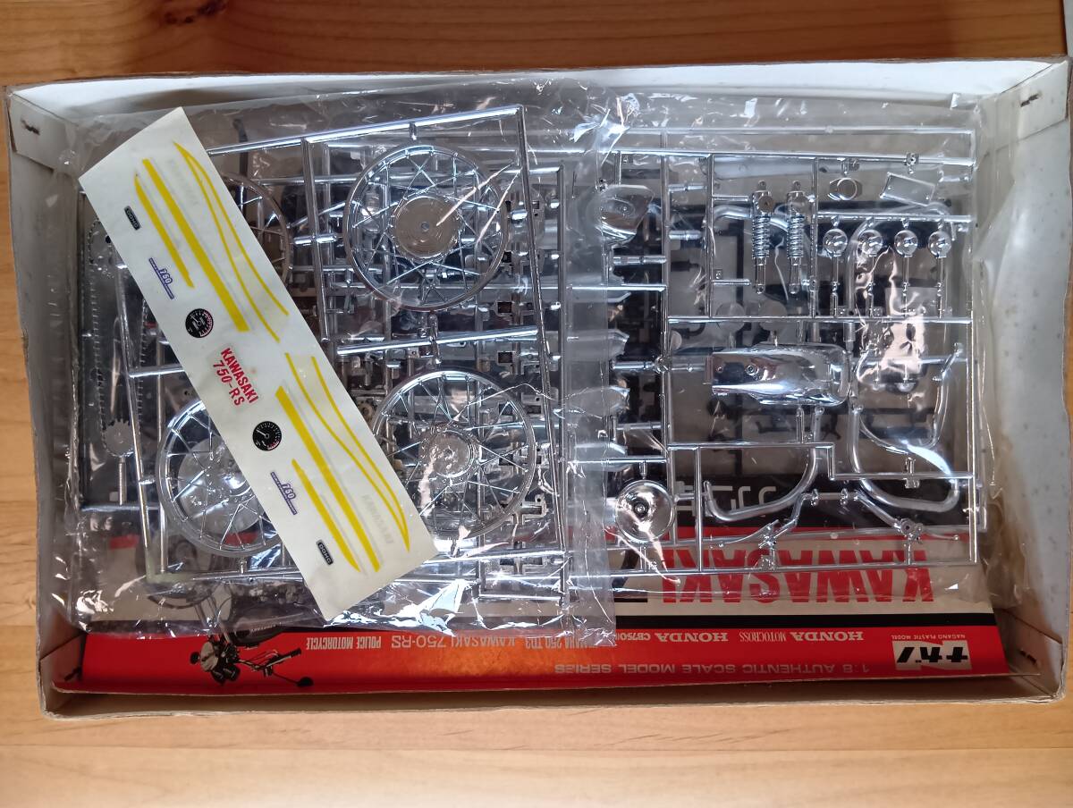 未組立ですが、かなり古いプラモデルなので外箱はかなり傷んでいます。部品は全て揃っていて、ランナー外れも見当たりません。