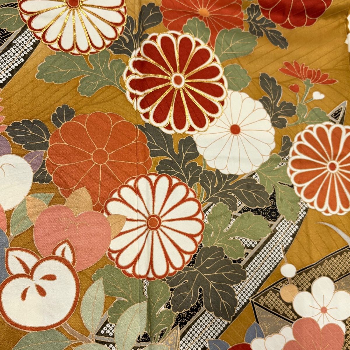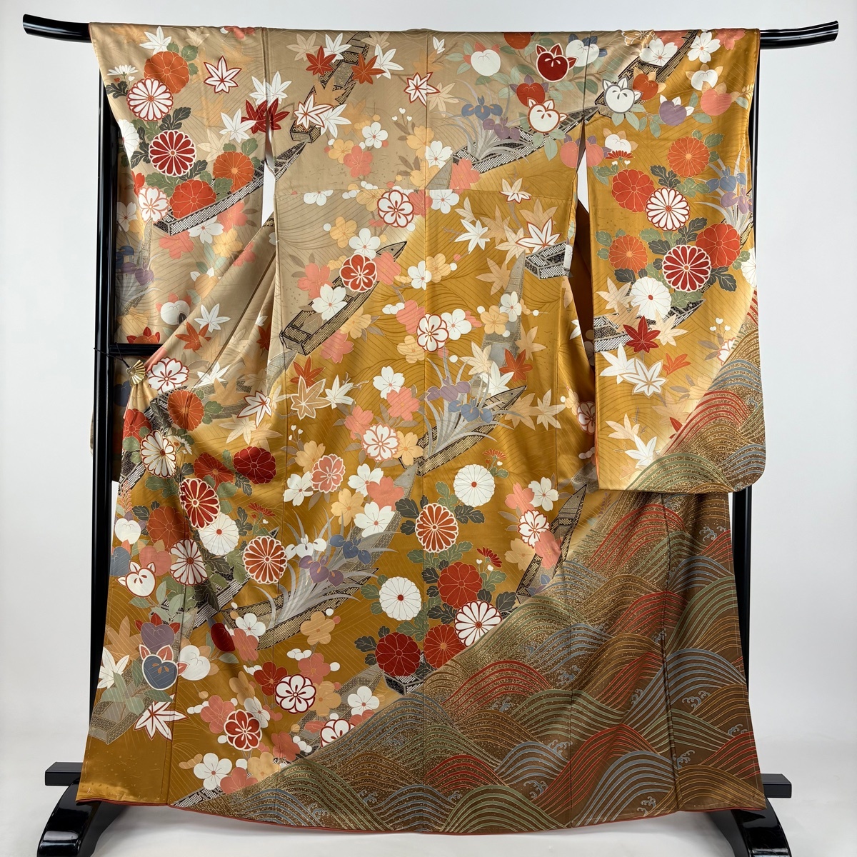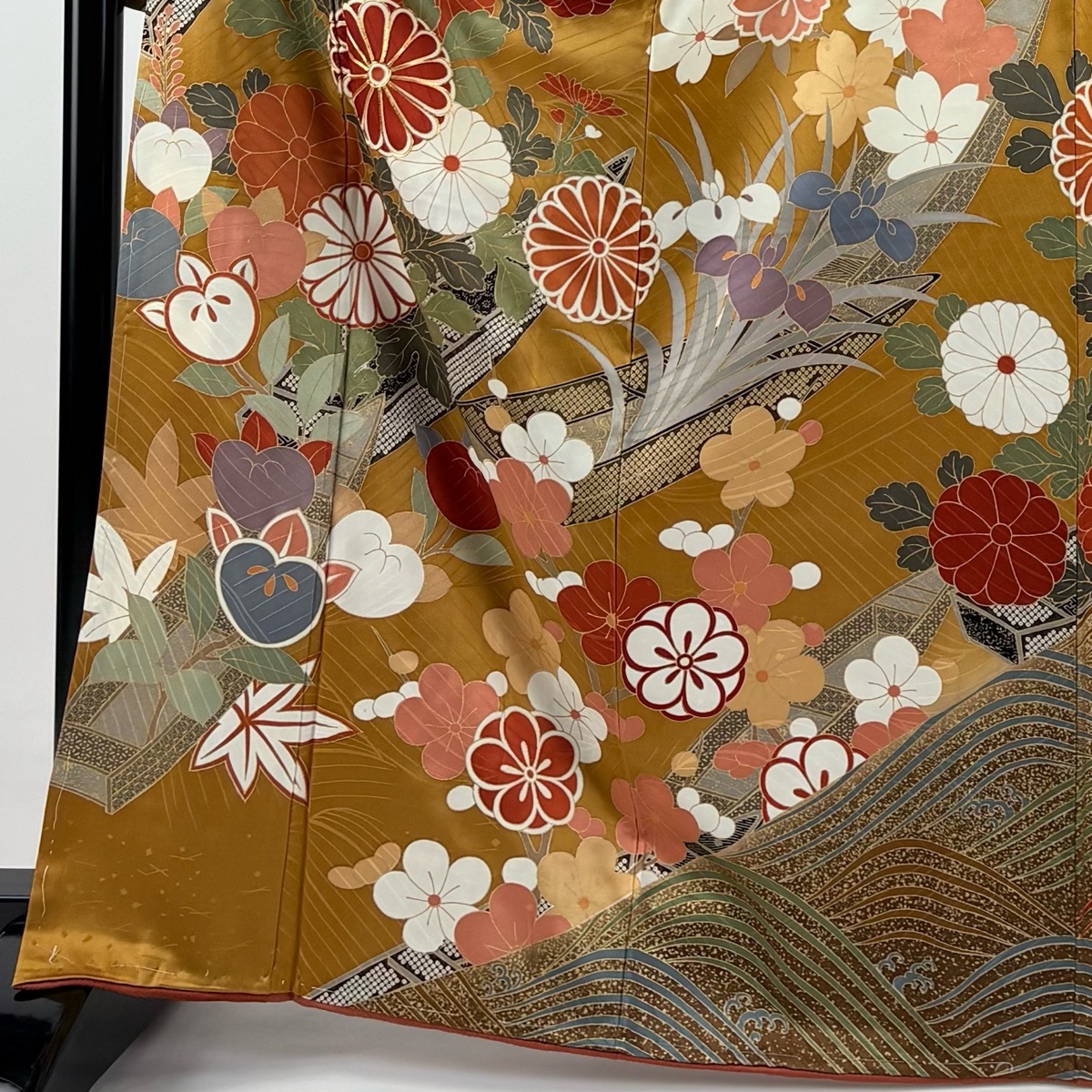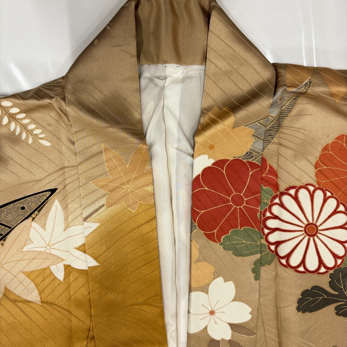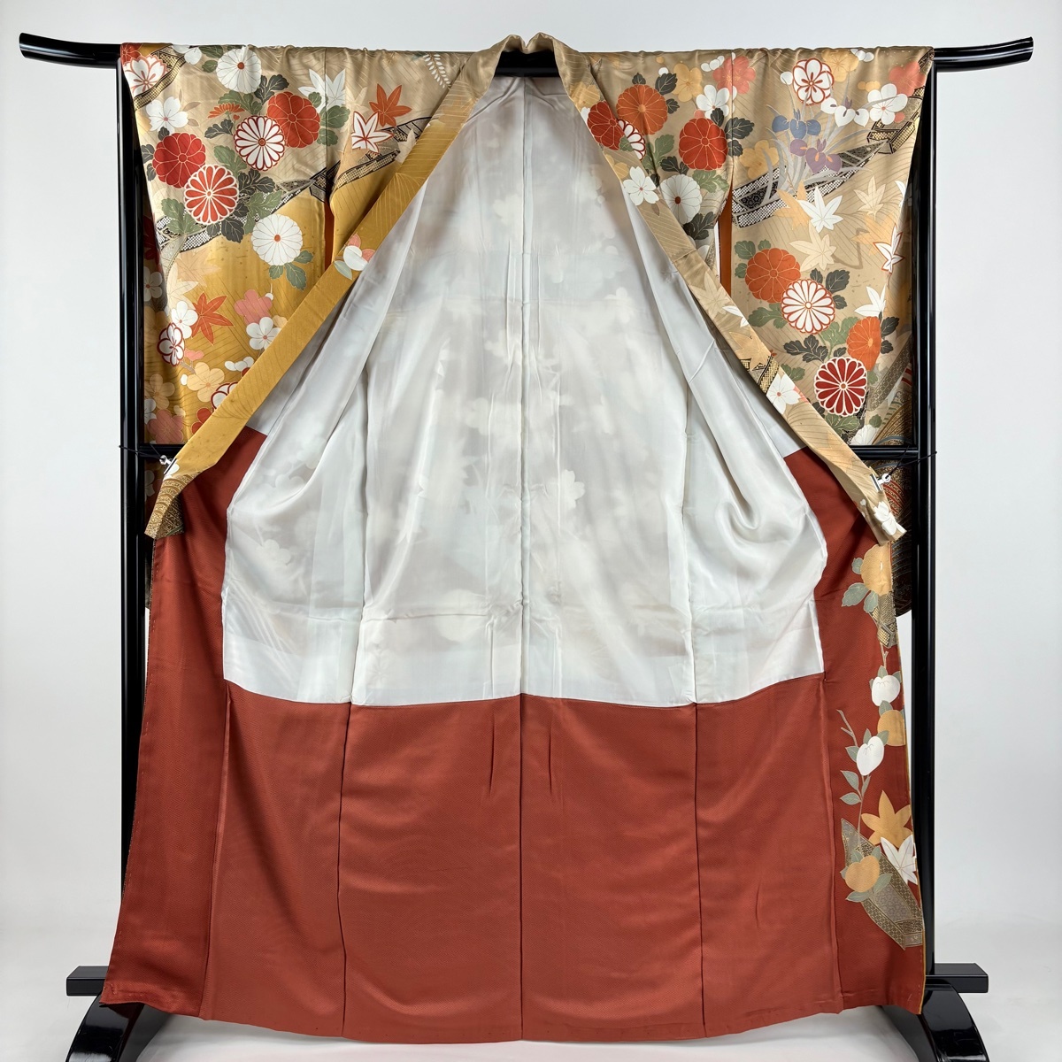 | 振袖 美品 秀品 バチ衿 舟 菊 金糸 金彩 薄茶色 袷 身丈166 裄丈67.5 L 正絹 【中古】 |