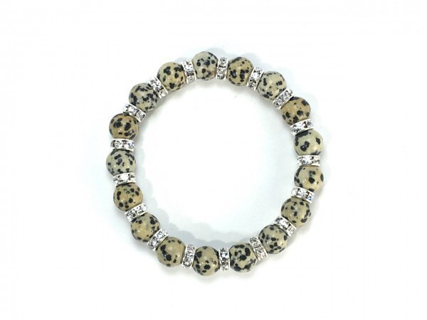 こちらは、10mm玉のダルメシアンジャスパーを使用したパワーストーンブレスレットです。間にはロンデルを挟み高級感あるブレスレットに仕上げています。石大きさは腕にも馴染みやすいように10mm玉を使用して、サイズは内径約18cmです。(サイズ調節も無料で承っています。サイズ変更の場合は落札後、取引ナビにてご一報くださいませ。) 数に限りがございますので気になる方はお早めにどうぞ。