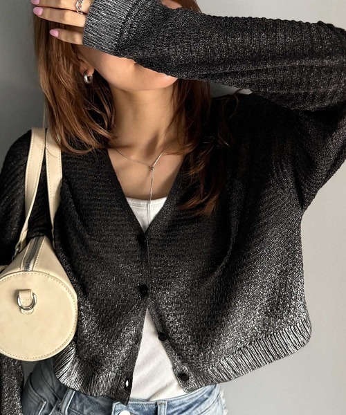 参考商品名:【mily bilet】冷房対策は、さりげキラ感で可愛く盛るのが正解◎箔プリントメッシュショート丈Vネックカーディガン(長袖)