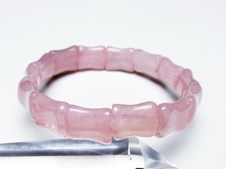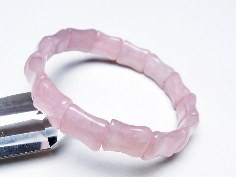 ■商品名: ローズクォーツバングル ■商品ID: T189-3674 ■商品重量:約 26.7g ■商品サイズ: 高約:15mm 横約:12mm 厚約:7mm 内径円周約:170mm(±5mm) 【ローズクォーツ(紅石英)】 ローズクォーツは柔らかい優しいピンクの水晶です。アルミニウムや酸化チタンなどの結晶を含むためにピンク色になると考えられています。これらの微細な結晶が分散しているため、石全体の透明度が低く、濁っていたりひびがあります。高品質の透き通ったものや、スター効果が確認できるものは珍重されています。 この石は愛や優しさ、内面美を象徴する石です。ローズクォーツと言うと「恋愛運アップ!」といったイメージが一般的ではないでしょうか。 ローズクォーツは持ち主の内面の美を高め、女性の幸せや喜び、愛を呼び起こしてくれるとされています。また過去の傷ついた経験から、ついネガティブ思考になったり自分に対してマイナス思考になったりするような、負の感情を優しさで包み込み癒し、自分を許し愛せるようになるそうです。 この石は目当ての異性を連れてくるというよりは、内面的に美しくなり自分を良い意味で大切にする自己愛を知ることにより他者から愛されるという効果のようです。例えば自分なんか大嫌い、自分なんかどうせ、と思っている時に、他人から愛されるでしょうか。それよりも自分を認めて受け入れ、愛していると内面が輝いて魅力が溢れます。その魅力により周囲の人から愛され、他人から愛されることにより一層他人を愛せるようになるという、愛を呼び込む循環を造ってくれるそうです。 そういった意味で、実は恋愛運アップというよりはもっと定義の広い愛情運アップの効果があるとされています。 こういった広い意味での愛を得ることができるとされ、人に対して思いやりを持ち許せるようになることから、人間関係の改善や、苦手だけれどどうしても付き合わなければならない人がいるといった場合でも活躍してくれることでしょう。 【水晶(石英、クリスタルクォーツ)】 水晶とは石英を指しますが、一般的に無色透明のものをクリアクォーツやロッククリスタルと呼んでいます。 水のように美しく透き通ったものが良いと思われがちですが、内部にヒビや他の鉱物などのインクルージョン(内包物)が入っているものがあり、それが天然物の証。また、インクルージョンによって様々な種類に分類され、それぞれ違った印象を与えてくれます。 古くから呪い事に使われてきた水晶に秘められたパワーはとても万能で、あらゆる場面に対応するといわれています。特に邪気を祓う力が強いため、人間関係を円滑にしたり、心身をクリアな状態にしたい場合に最適です。また空間を浄化する作用もあるとされ、インテリアとしても高い人気を誇っています。 石自体に強い自浄作用があり、他のパワーストーンが吸収した負のエネルギーを浄化するといわれています。更にアクセサリーとして他の石と組み合わせる場合、それぞれの石の個性を引き出しバランスを取ってくれる効果があるそうなので、ぜひとも組み込んでおきたいですね。 パワーストーン入門に最適な水晶ですが、愛好家にとってはかなり奥が深く最後に行き着くのもこの石なんだそうです。何もかもを見透かすような透明な水晶には、本当に神秘的なパワーが宿っているのかもしれません。 |