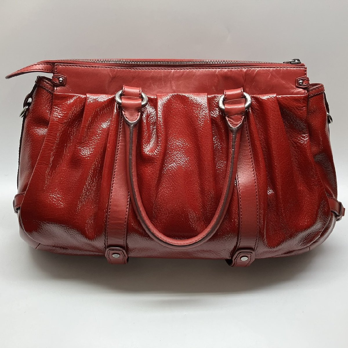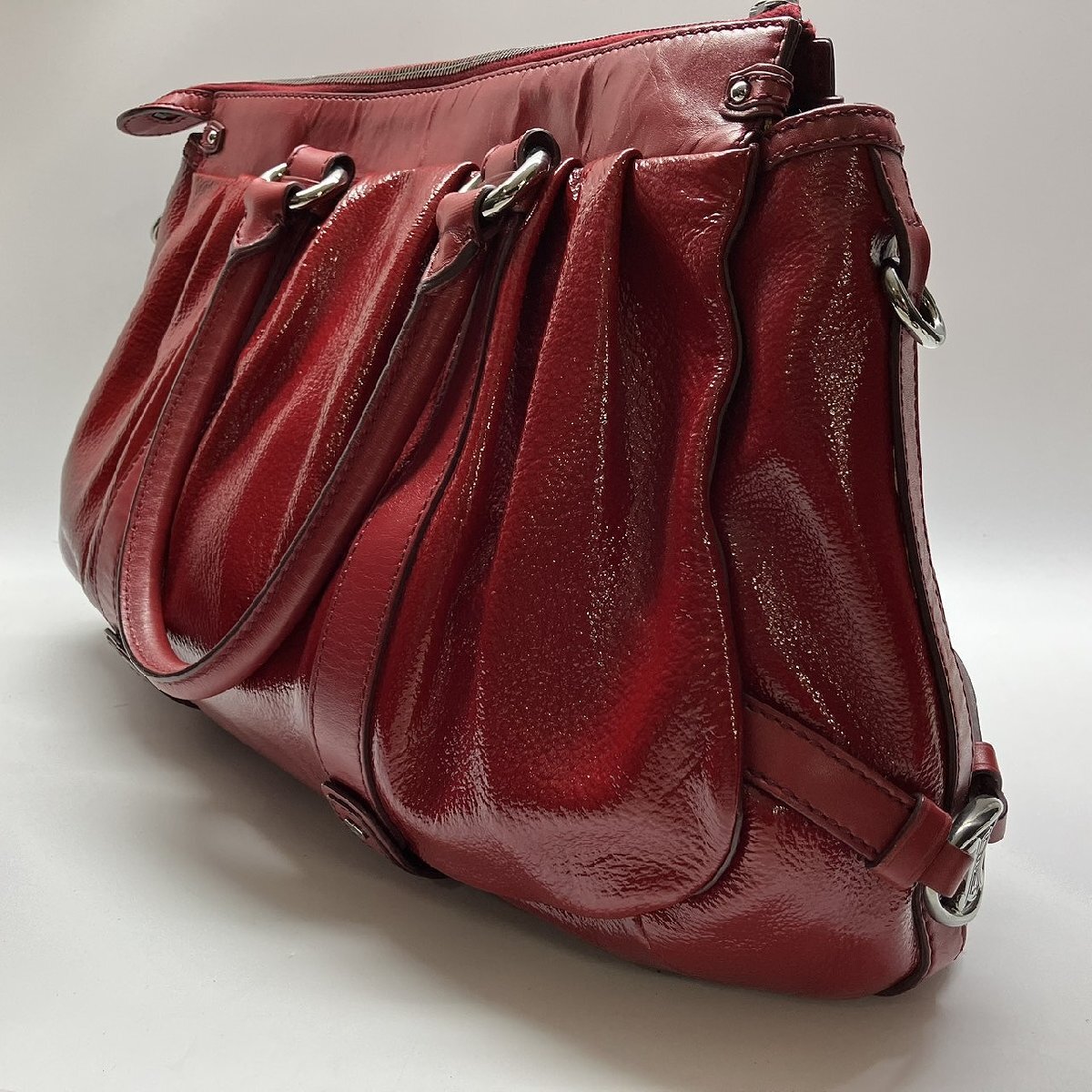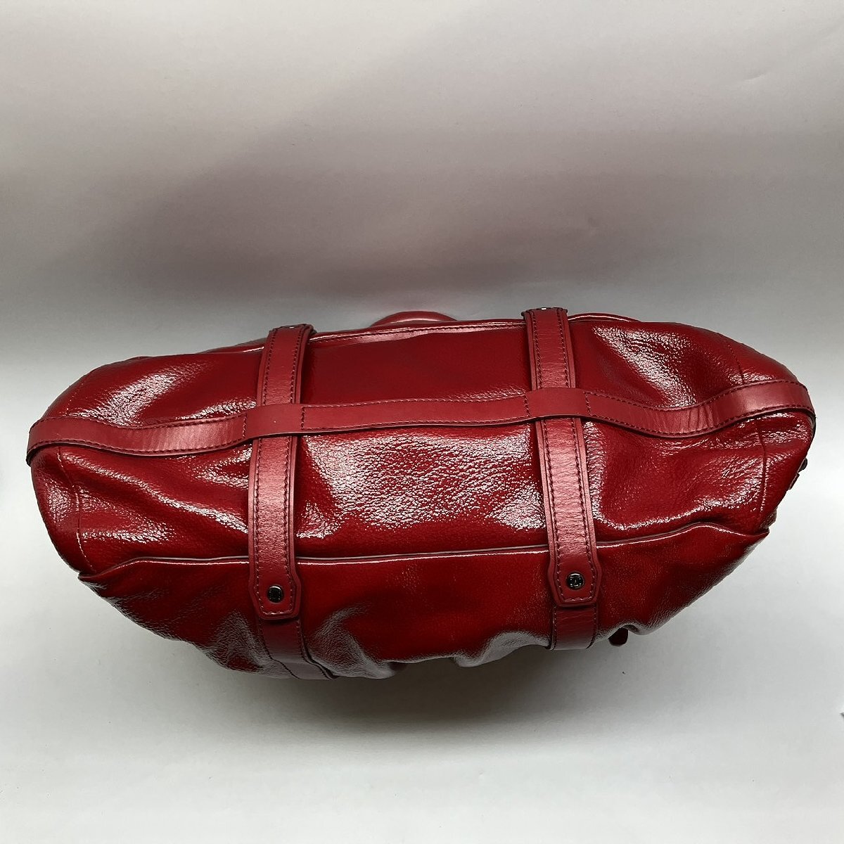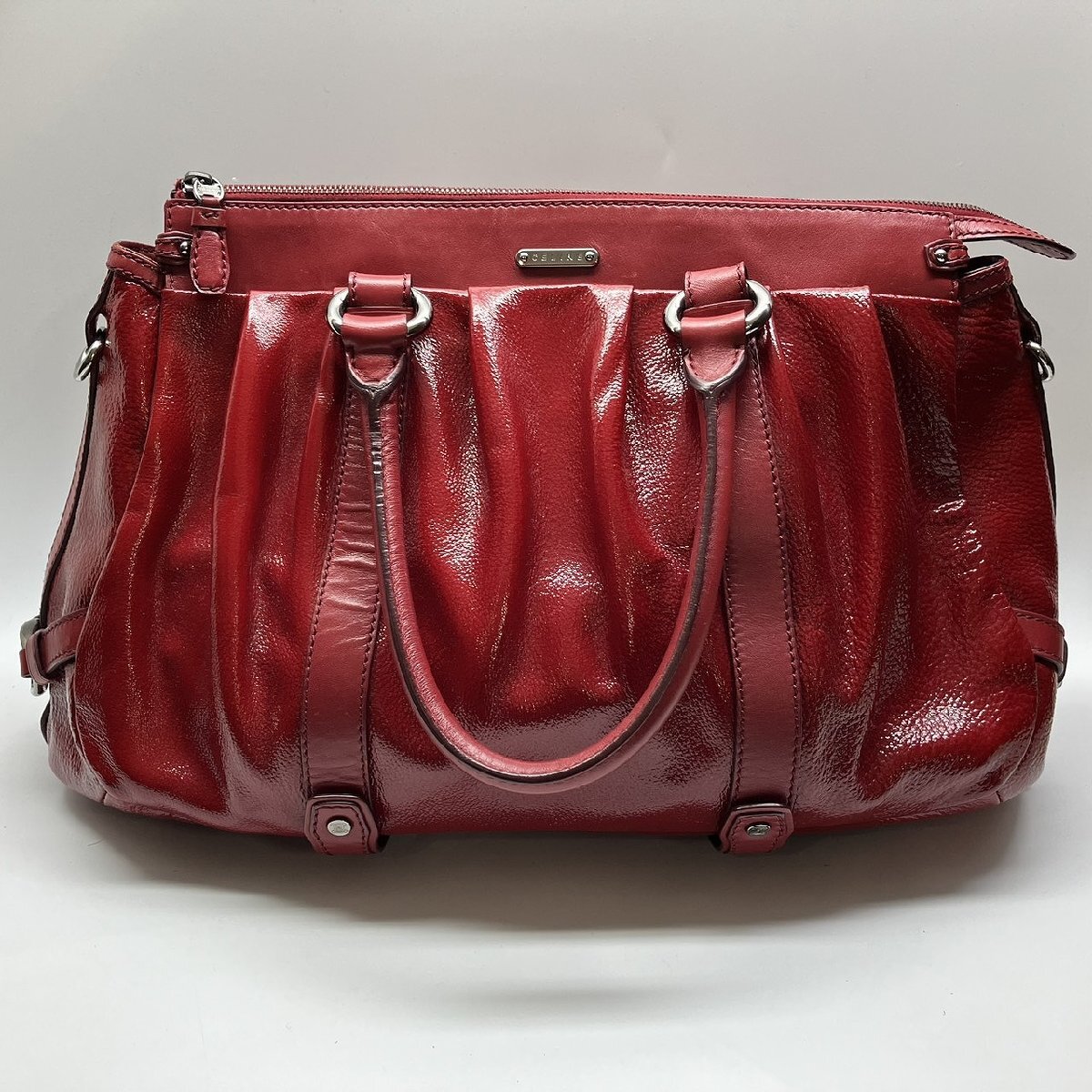 パテントレザーを使用し、2つのトップハンドルとショルダーストラップで持ち手がしっかりと固定されます。