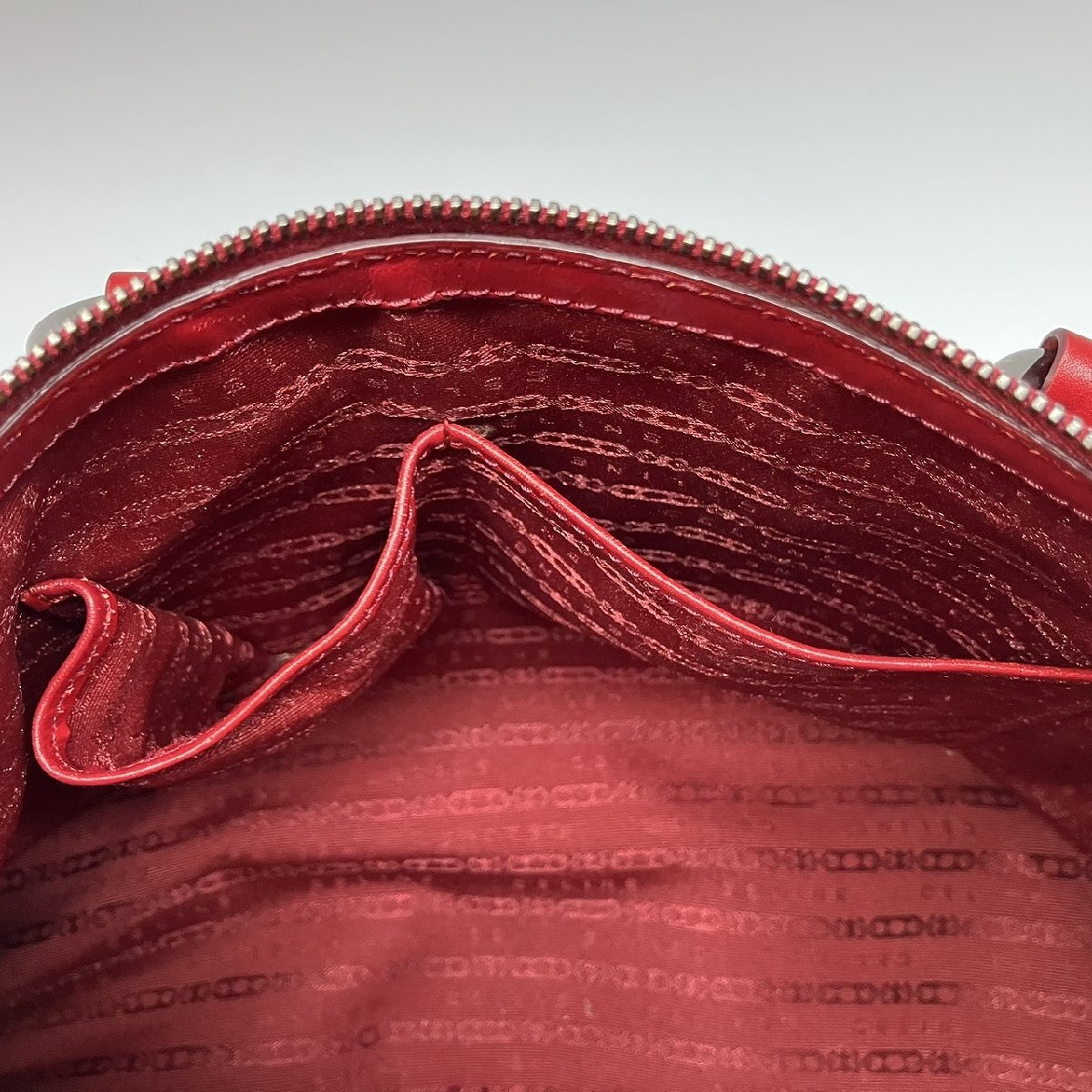 このデザイナーレッドのトートバッグは、ファブリックのライニングとゴールドトーンの金具が特徴です。