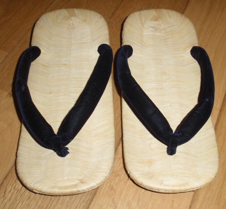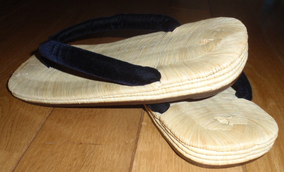 表は細かな編みの本畳表で、鼻緒は本店ビロードの濃紺色、底面は前2枚、踵4枚重ね、赤牛革底、踵プロテクター付きの丈夫な作りです。