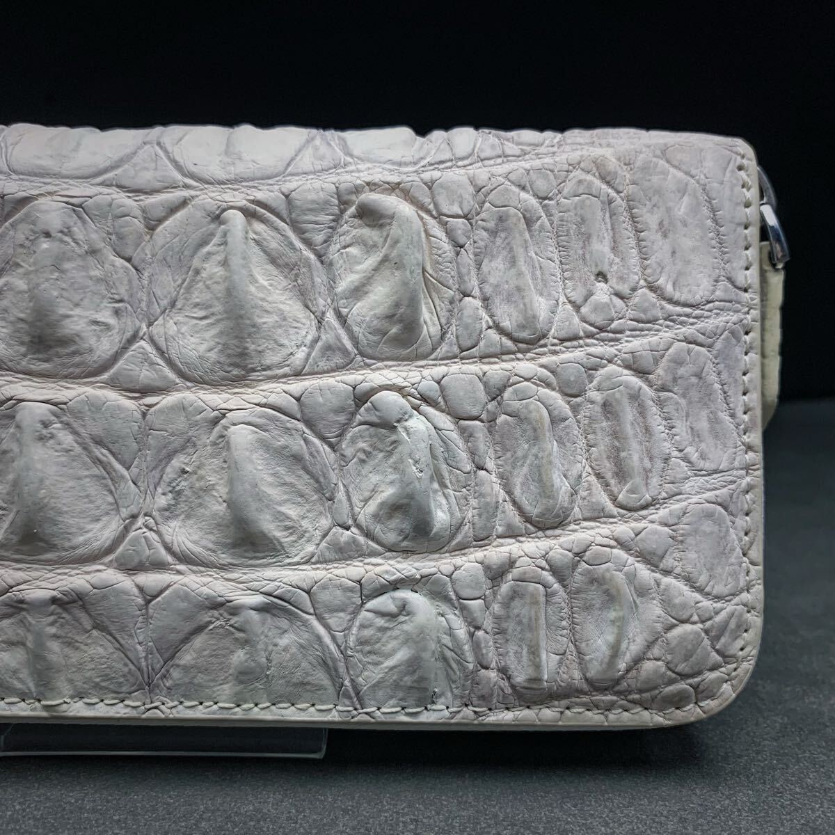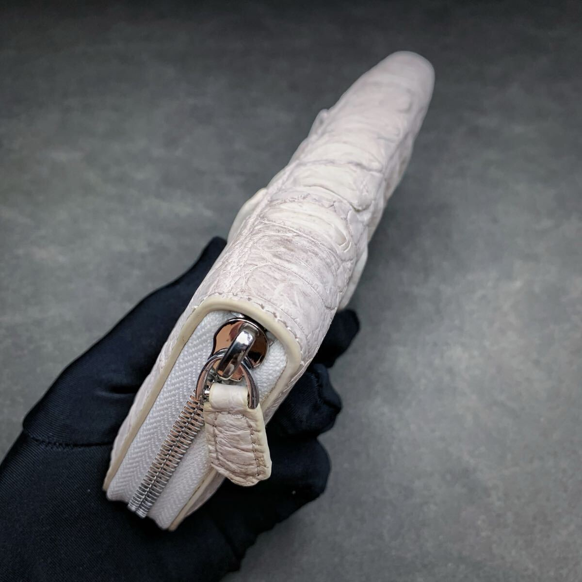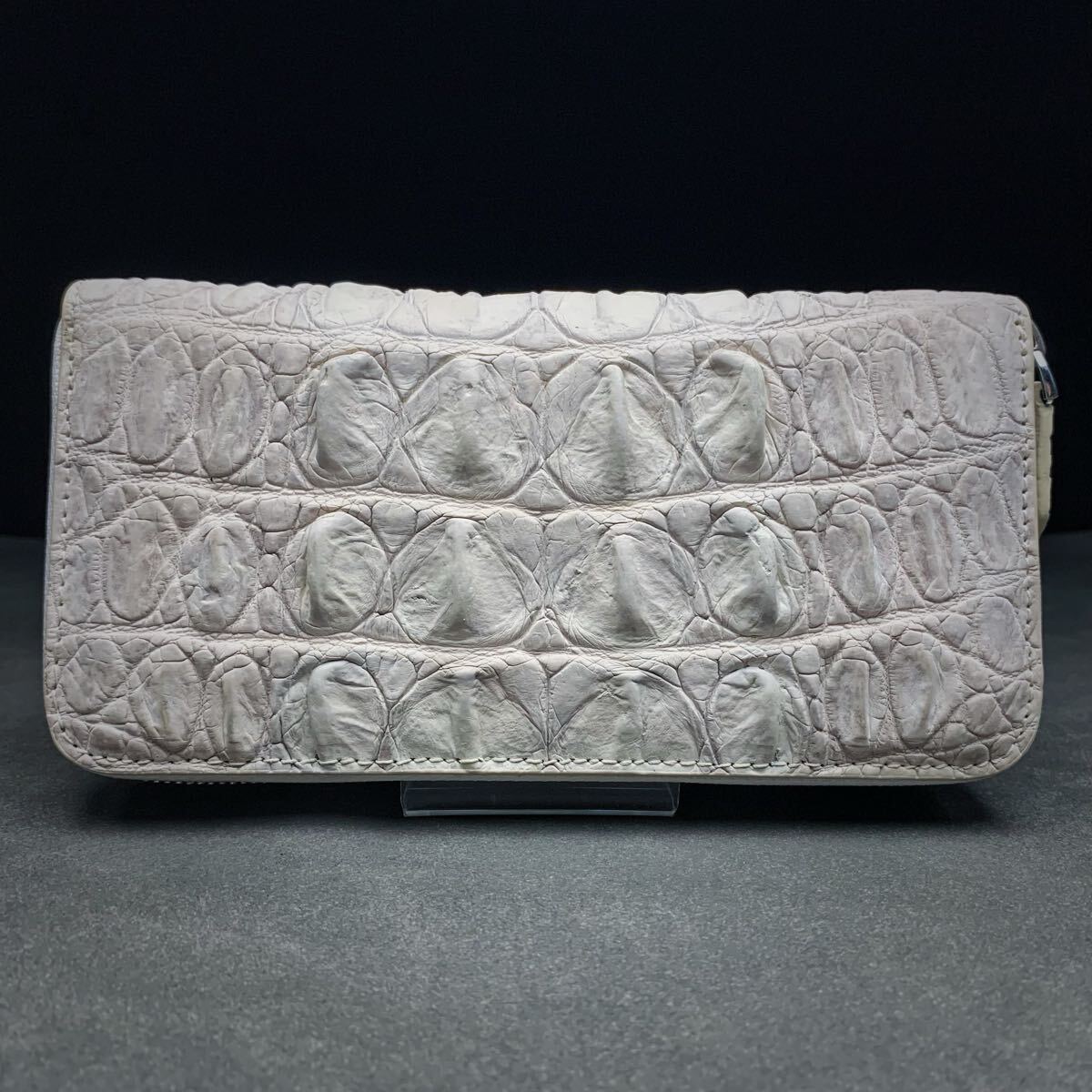 クロコダイルと呼ばれている品種のワニ革は人気が高く、独特の模様と凹凸が魅力で、高級ブランド品を中心にクロコダイルが多く使われています。今回はワニ革の代表格である<シャムクロコダイル>の背革部のラウンドファスナー財布を出品します。