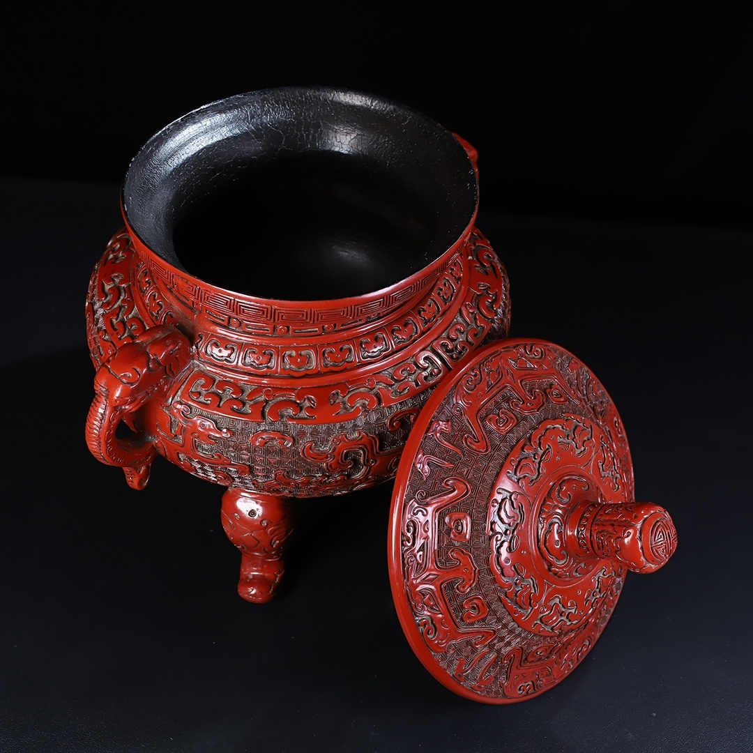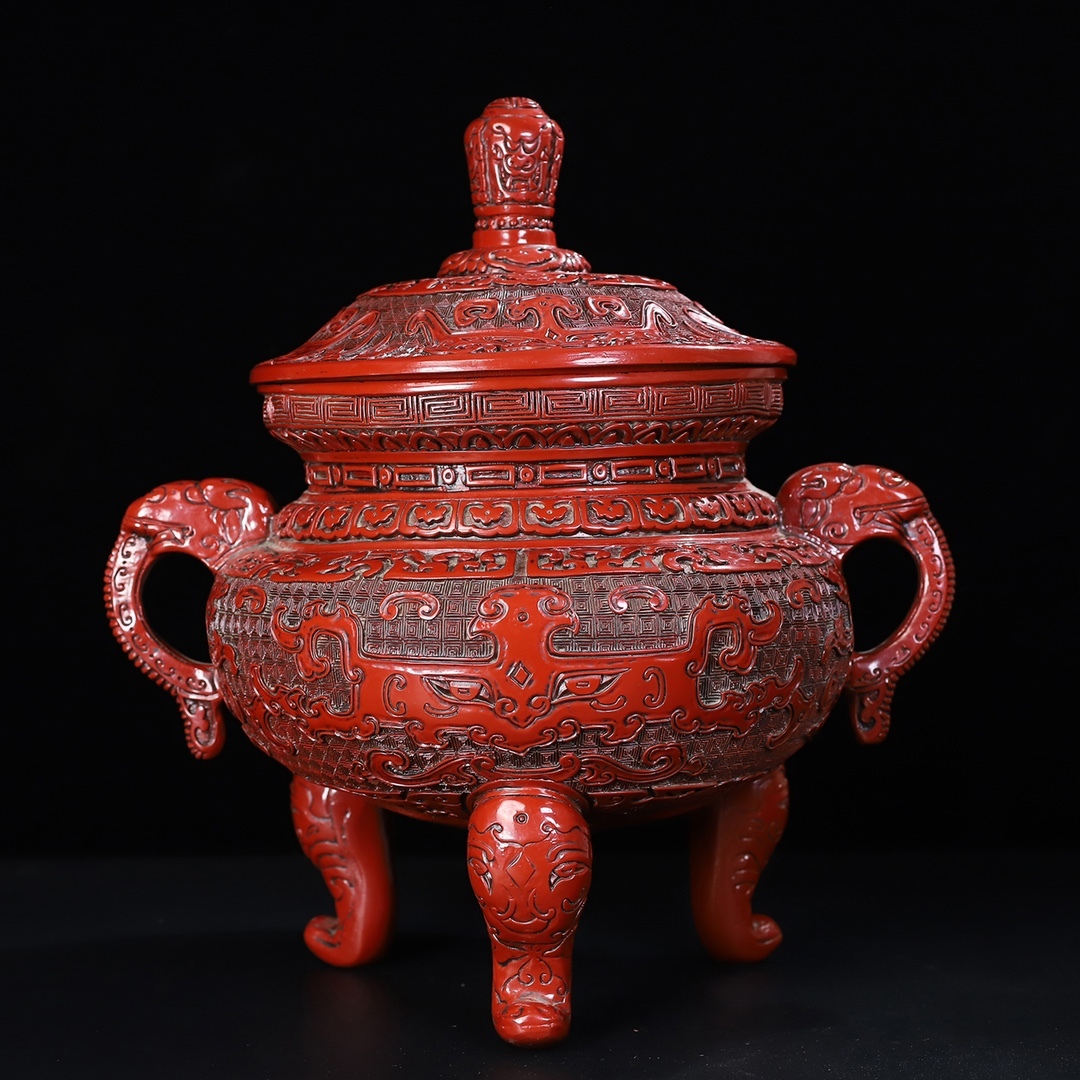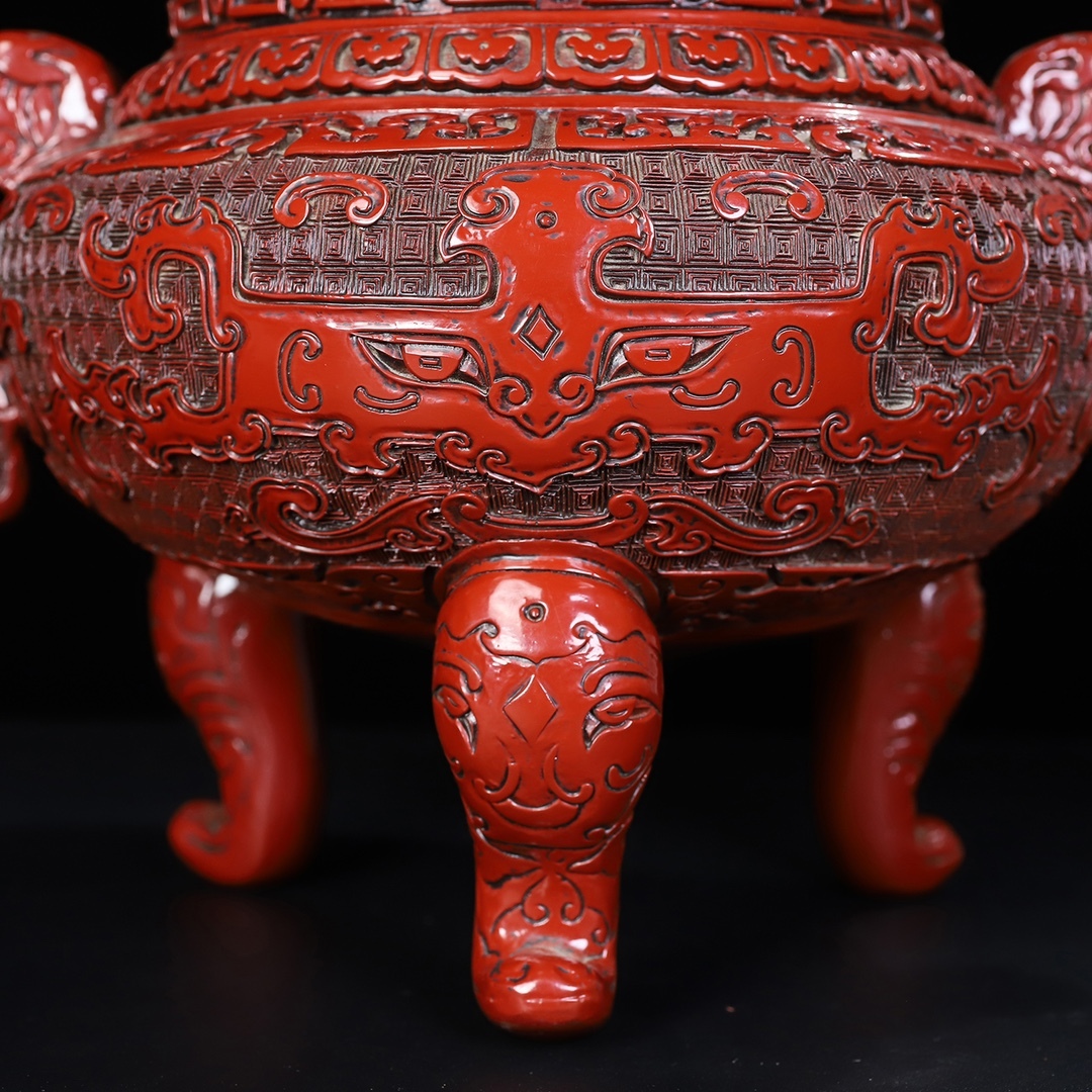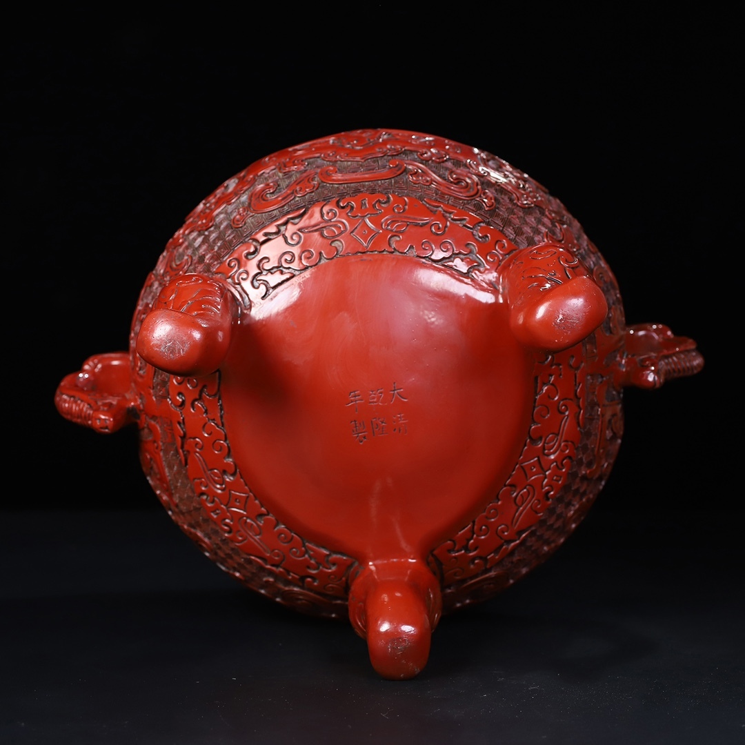 旧蔵 清 乾隆年製 剔紅漆器 獸紋 雙耳三足香爐 置物 香道具 極細工 中国古玩 骨董品 古美味 210