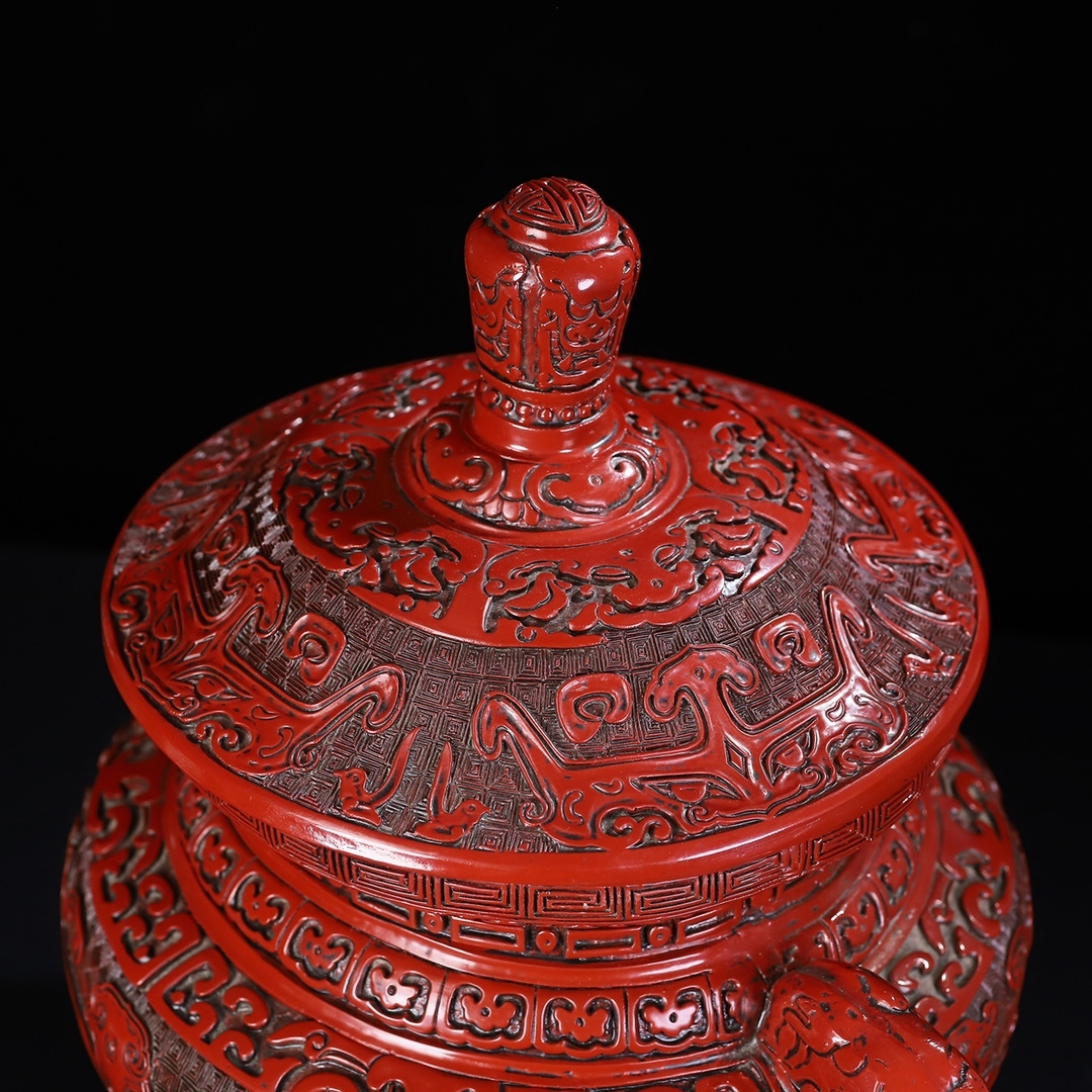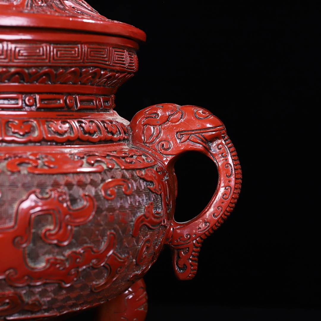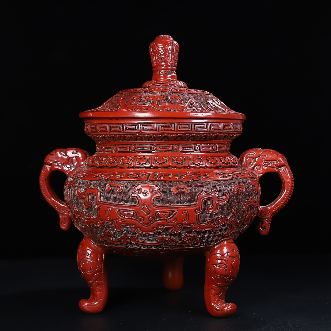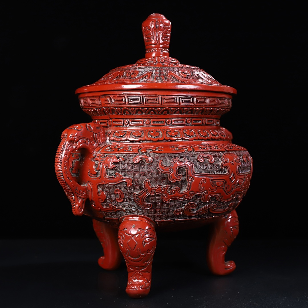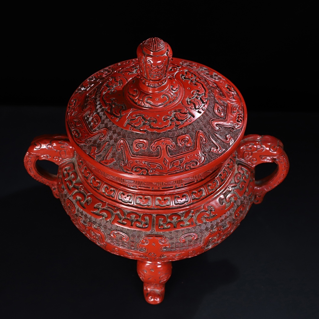 旧蔵 清 乾隆年製 剔紅漆器 獸紋 雙耳三足香爐 置物 香道具 極細工 中国古玩 骨董品 古美味 210