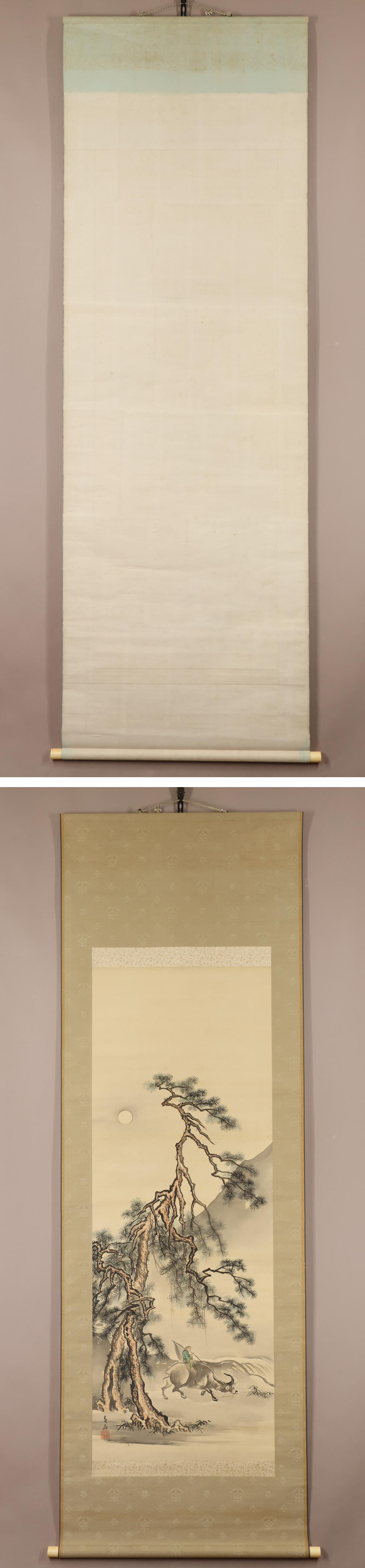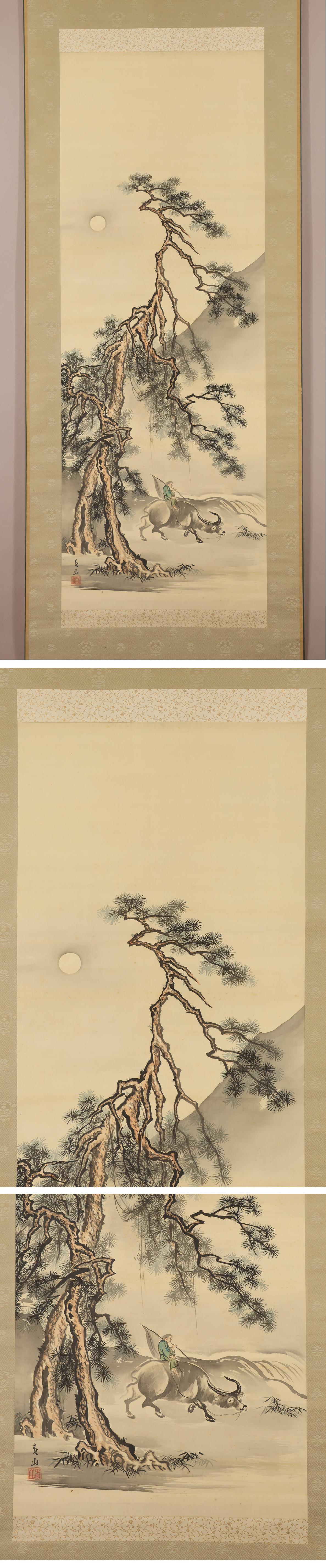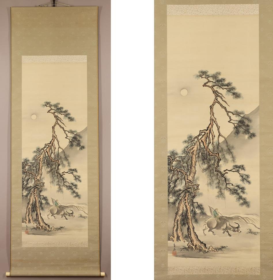 【真作】八木岡春山◆月下牛図◆日本画◆肉筆◆絹本◆掛軸◆w851