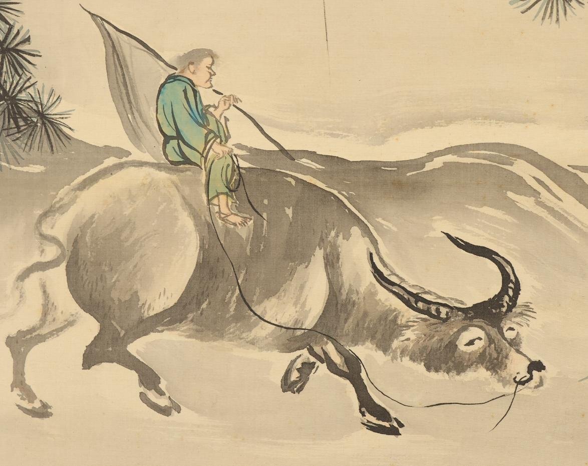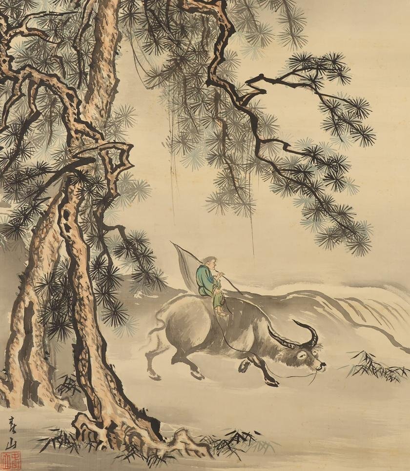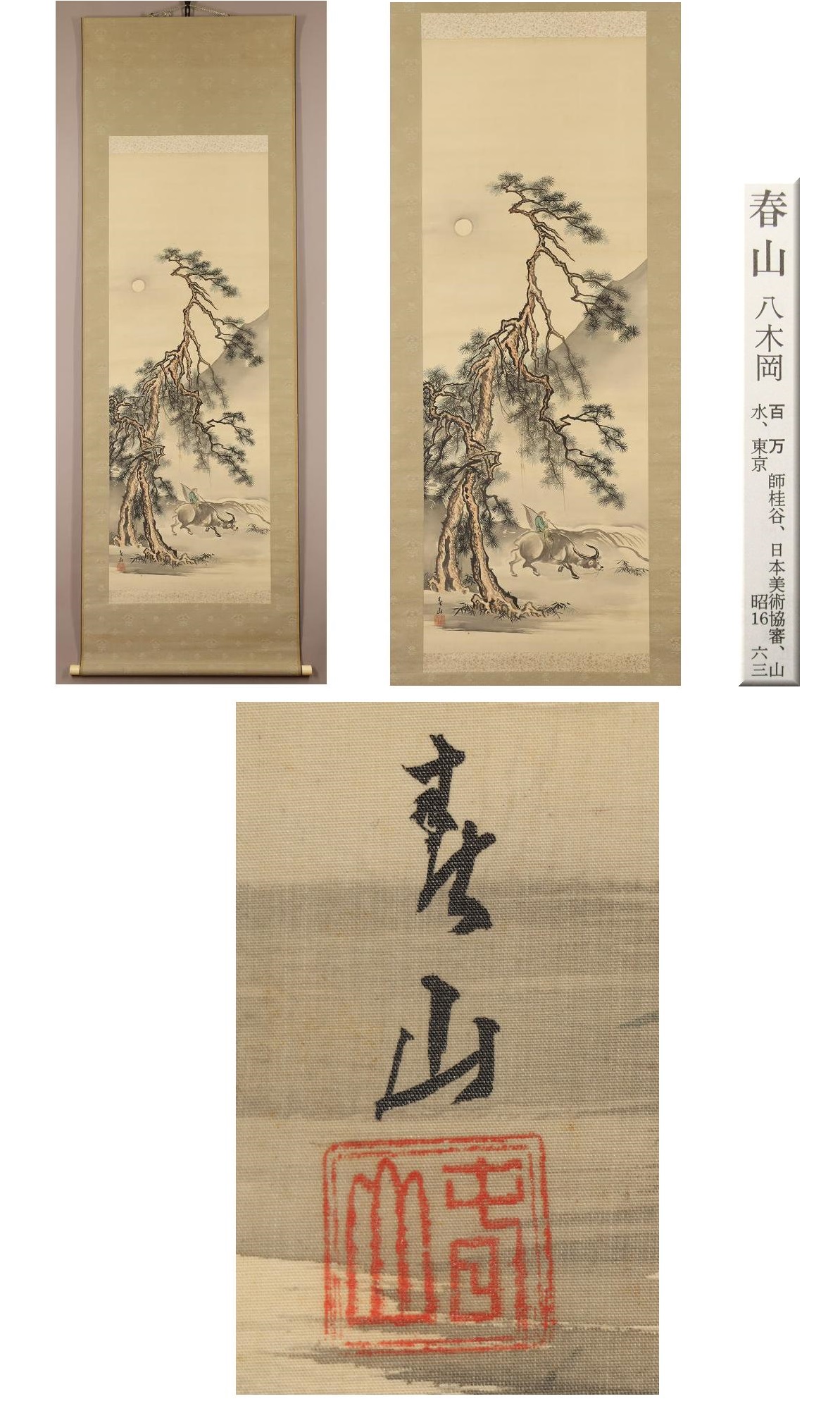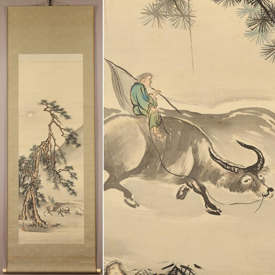 【真作】八木岡春山◆月下牛図◆日本画◆肉筆◆絹本◆掛軸◆w851