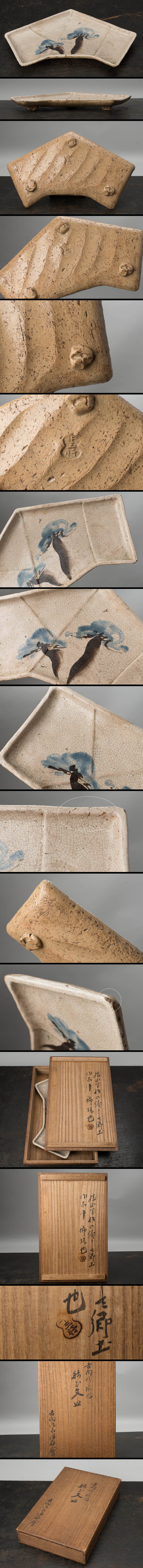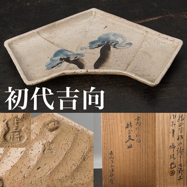 | 初代吉向の結び文皿。江戸時代。極箱有。 印銘は「十三軒」のみで、「吉向」の拝領印はありません。 吉向印を用いる以前の作品かもしれませんが、この十三軒の印は晩年まで 使われています。 サイズは、幅約26x17cm、高さ約2.5cm。 縁に欠けと欠けの接着補修あります。 状態、詳細は画像でご確認ください。 |
