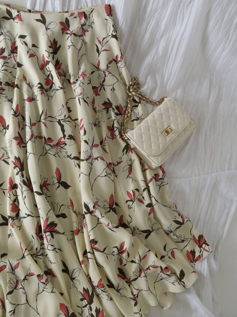 エレガントなフラワープリントのスカート。適度なハリとドレープ性を兼ね備えた素材を使用し、きれいめな印象に。ドライな肌触りで、暑い夏でも快適に過ごせます。