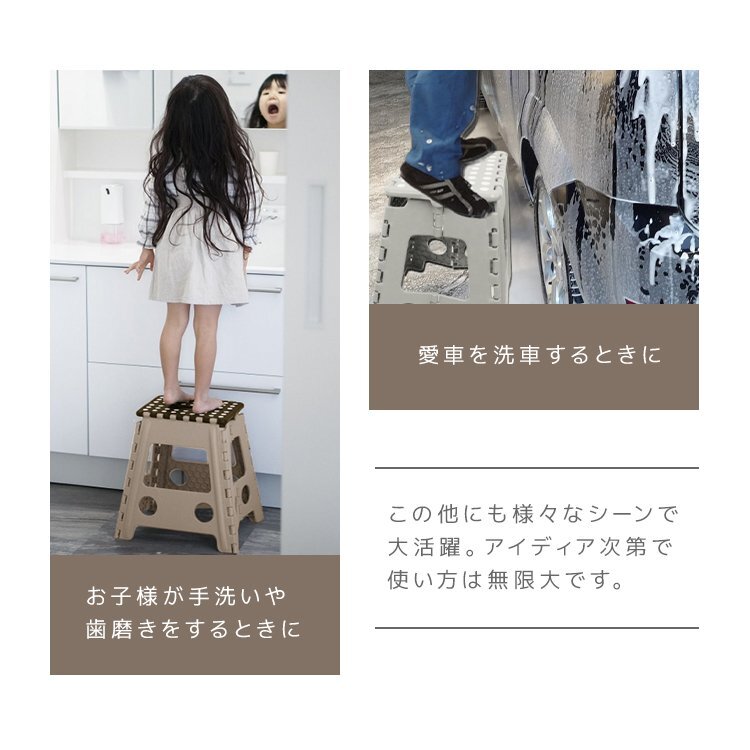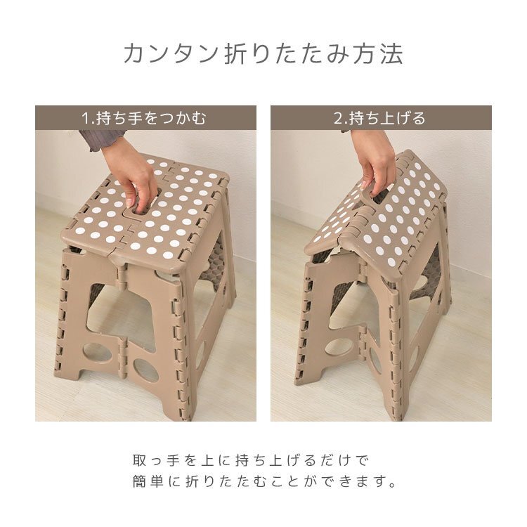 踏み台や折りたたみの椅子として、おうちに1台あると、とってもお役立ちのスツールです。 耐荷重は150kgまでなので、もちろん、大人の方が乗っても安心。 キッチンにて高いところのものを取ったり、玄関にて靴をはくときにちょっと腰掛けたり、野外に持ちだしてキャンプやスポーツのときの椅子としても活用できます。 洗車をする時の踏み台として、車に常備しておくのもいいかもしれません。 用途はまだまだたくさんありそう、あなたの生活スタイルにあわせて、スツールをご活用ください。 折りたたむとカバンのようなカタチになるので、持ち運びもラクラク。 簡単に組み立てることができるので、お子様でも簡単に折りたたむことができます。 【商品仕様】 カラー:グレー×グレージュ サイズ ・使用時:(約)幅39cm×奥行32cm×高さ39cm ・折りたたみ時:(約)幅39cm×奥行4cm×高さ52cm 重量:(約)1.5kg 耐荷重:(約)150kg 素材:ポリプロピレン、EVA 【注意事項】 ※転倒やケガにつながる恐れがありますので必ず、平坦な場所でのみご使用ください。 ※折りたたみ時に各部に手を挟まないよう、十分にご注意ください。 ※商品を使用して発生した事故・トラブル・破損等につきましては一切の責任を負いかねます。 |