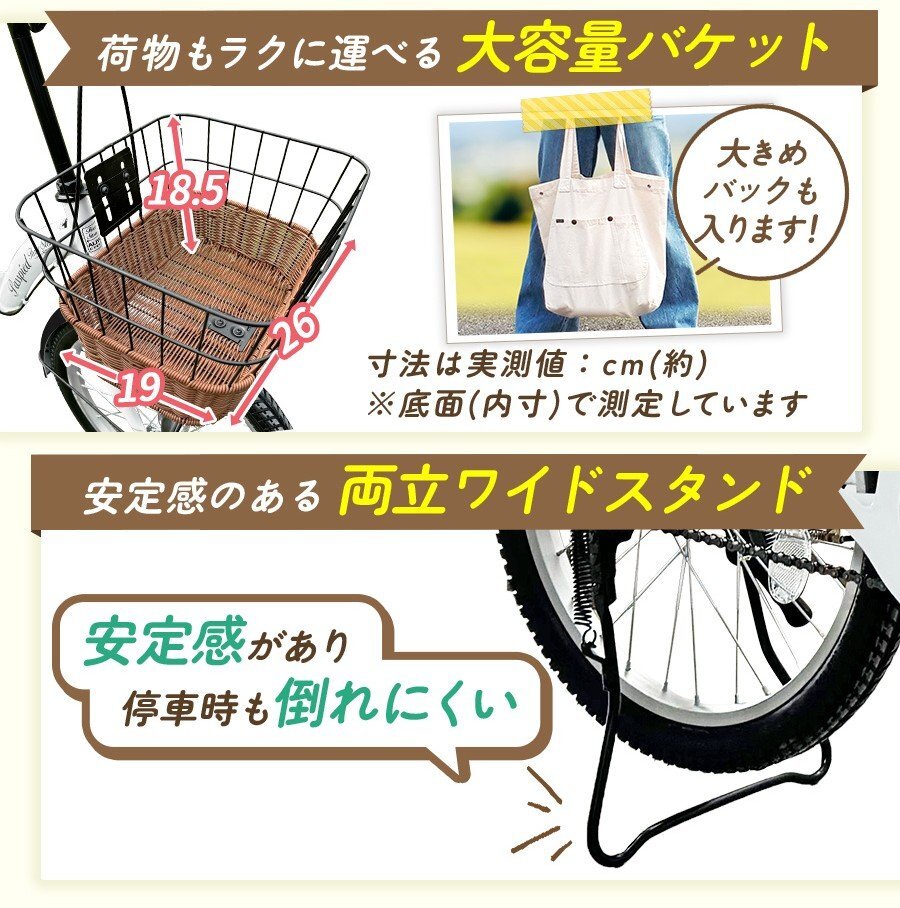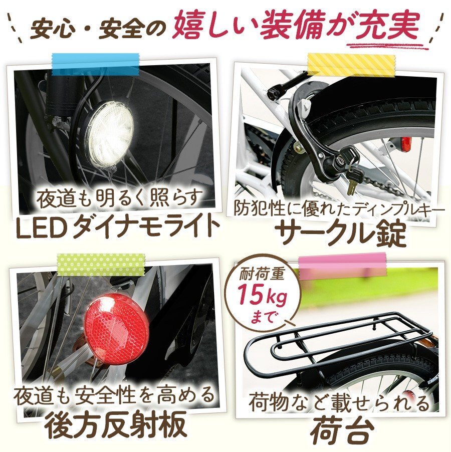 ■付属品:前カゴ・荷台・LEDダイナモライト・サークル錠・空気入れ・簡易工具・取扱説明書