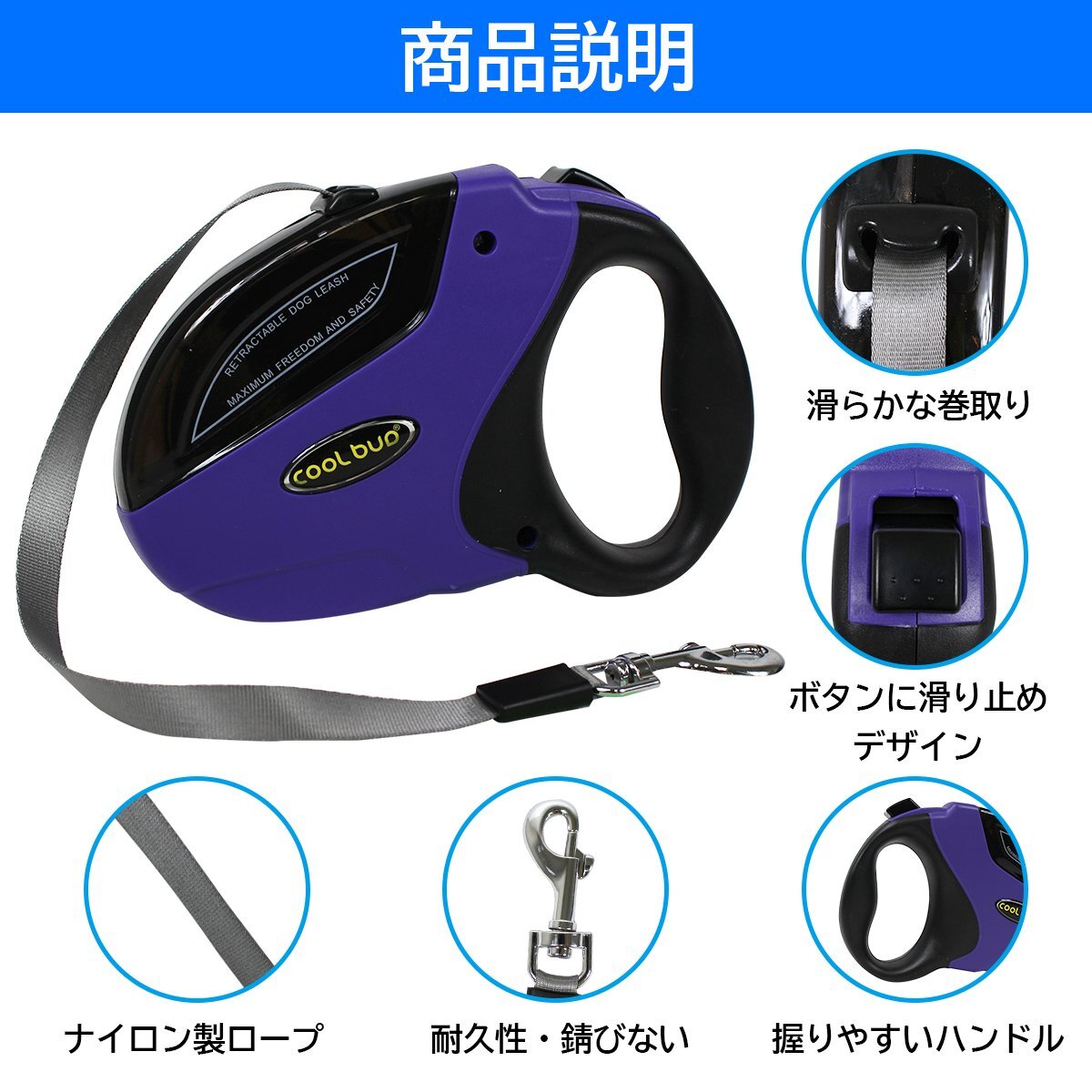 【新品即納】便利なロック機能付き!犬用 伸縮 リード 5m/5メートル 自動巻き取り パープル 紫 ペット 散歩 小型犬 中型犬 犬 ヒモ
