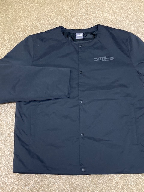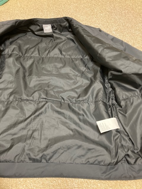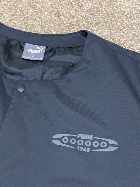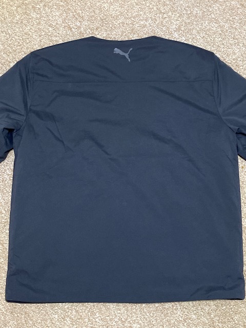 プーマのクルーネックのナイロンブルゾンです。インナー素材は中綿です、サイズL、身幅57㎝、着丈68㎝、肩幅48㎝、袖丈66㎝、色ブラックです。USEDですが美品です