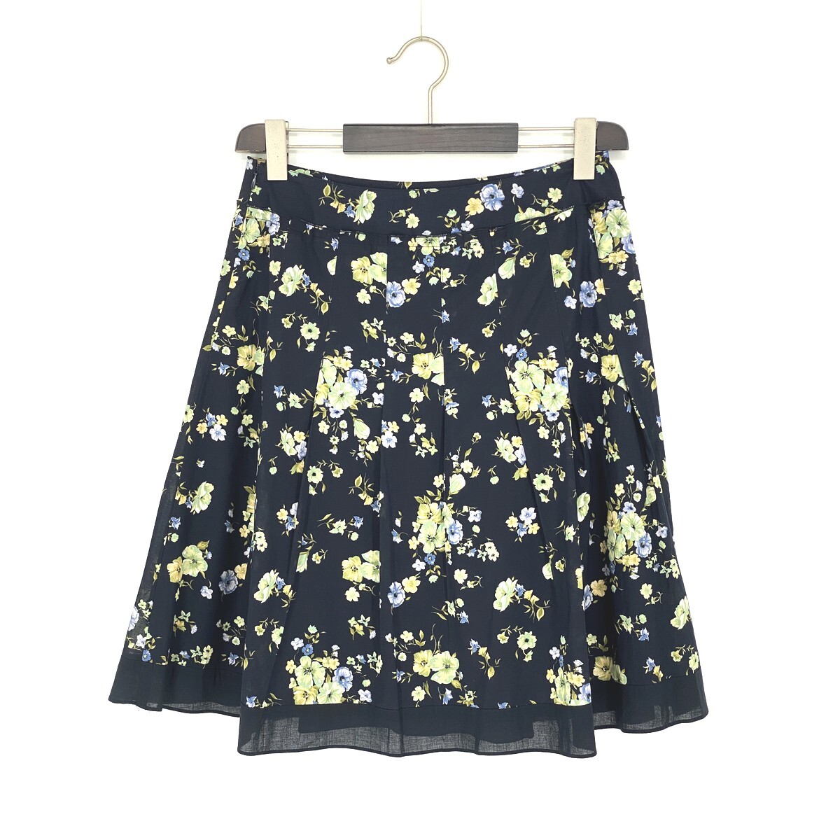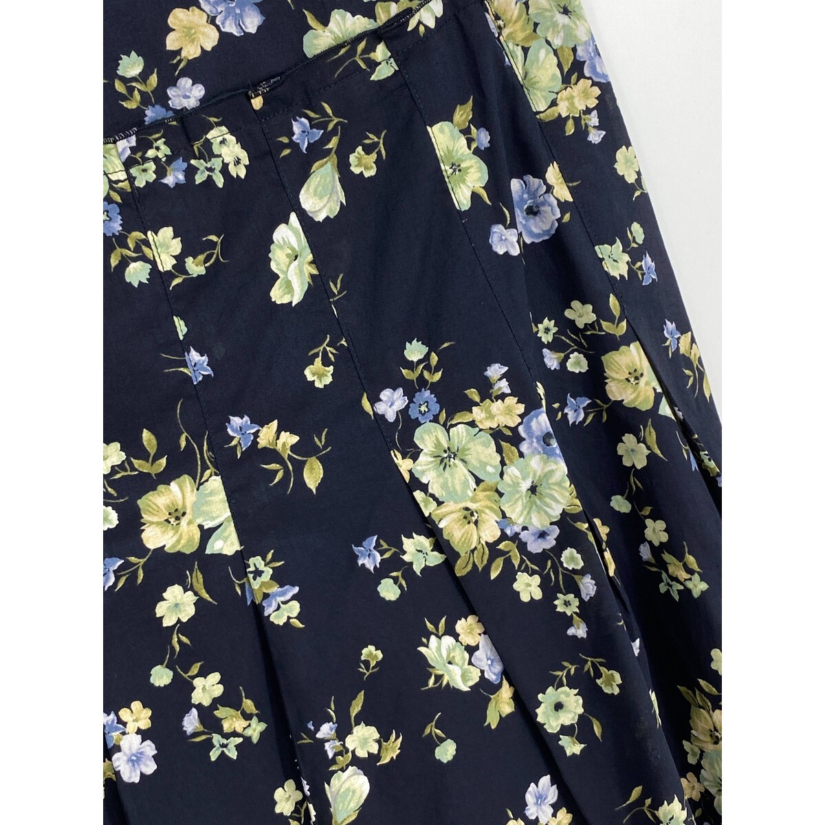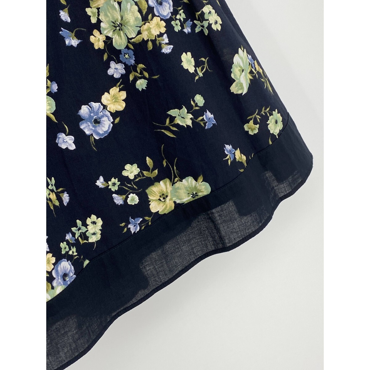 B0915/極美品 LAURA ASHLEY ローラアシュレイ コットン 花柄 総柄 プリーツ ギャザー フレア 膝丈 ミモレ丈 スカート 13 XL 紺 レディース