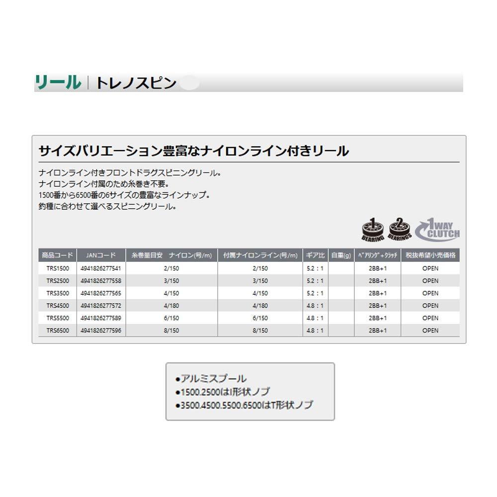 ナイロンライン付きのフロントドラグスピニングリールです。ナイロンライン付属のため、すぐに使用が可能です。1500番から6500番までの計6アイテムのラインナップで用途に合わせてお買い求め下さい。釣種に合わせて選べるスピニングリールです。