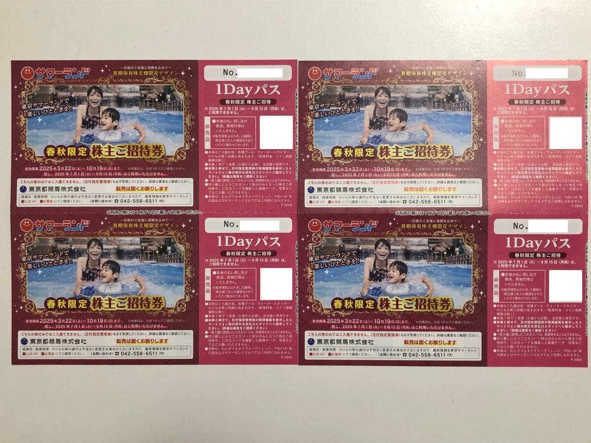 4枚★迅速発送★匿名配送料込★東京サマーランド春秋限定1Dayパス(株主ご招待券)