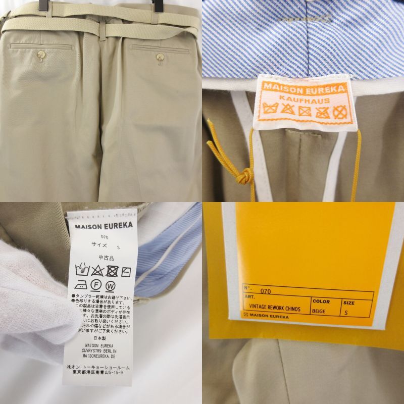 SIZE | 表記SIZE:S ウエスト(調節可能):約92cm 股上:約32cm 股下:約74.5cm ワタリ:約33cm 裾幅:約25cm 平置き採寸での計測となるため、公式サイトの計測と多少のズレが生じることもございますのでご了承ください。 計測には細心の注意を払っておりますが多少の誤差はご了承下さい。 |