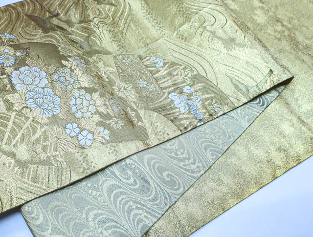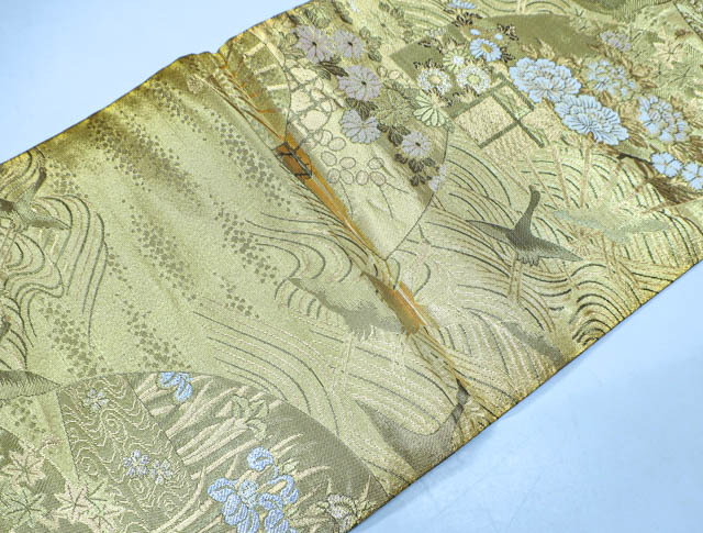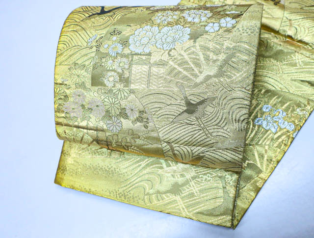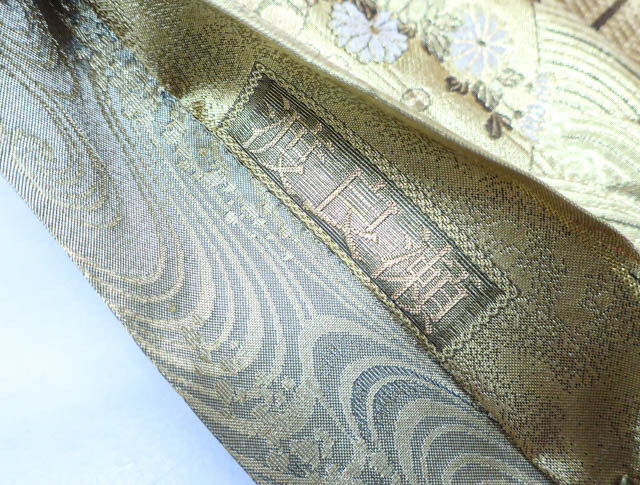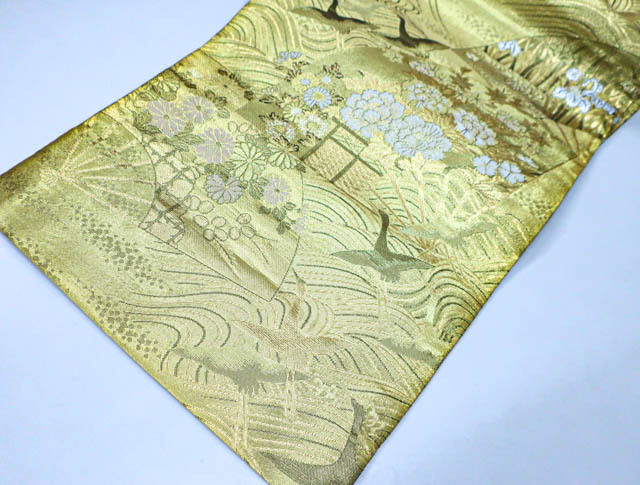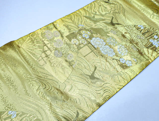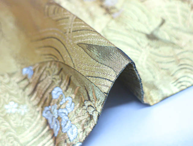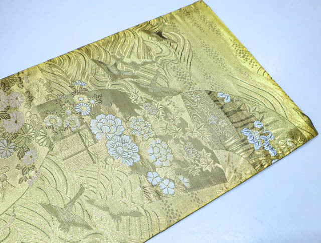 リサイクル商品ではございますが、大変良い状態のお品です。 地色は、金色です。 1枚目の画像が近いお色かと思われます。 素材は正絹・化繊です。 |