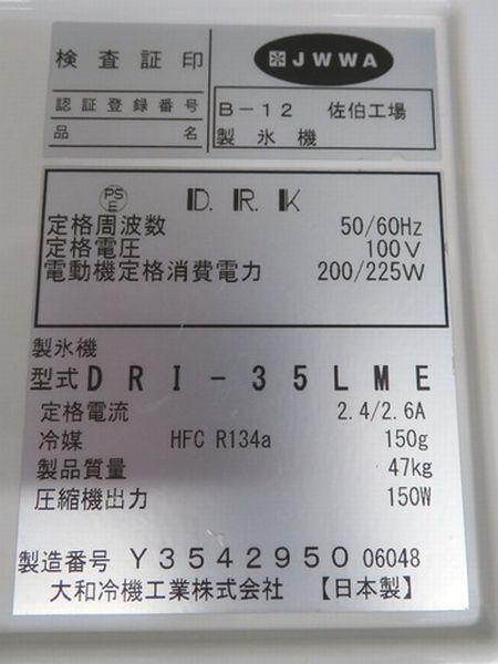 ◆ダイワ◆製氷機 DRI-35LME 100V 500×450×800 2018年 サイズ:W500×D450×H800mm 電 源:100V 製氷能力:約38/42kg/日(室温20℃・水温15℃) 約34/36kg/日(室温30℃・水温25℃) 1回の氷の数:30個 製品質量:47kg 送料無料(北海道・沖縄・離島は除く) 出品にあたり動作確認・クリーニング済みです。 多少の傷・使用感等がありますので、予めご了承ください。 中古品ですので、画像をよくご確認の上、ご理解頂ける方のご入札をお願いいたします。 神経質な方はご入札をご遠慮ください。 気持ちの良いお取り引きにしたいと思いますので、ご不明な点等ございましたらお気軽にご質問ください。 | |