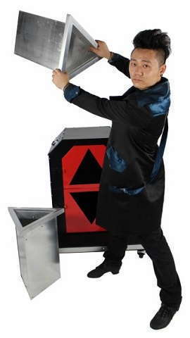 演者はドアを閉めて箱の中央に2枚の刃板を差し込みます。