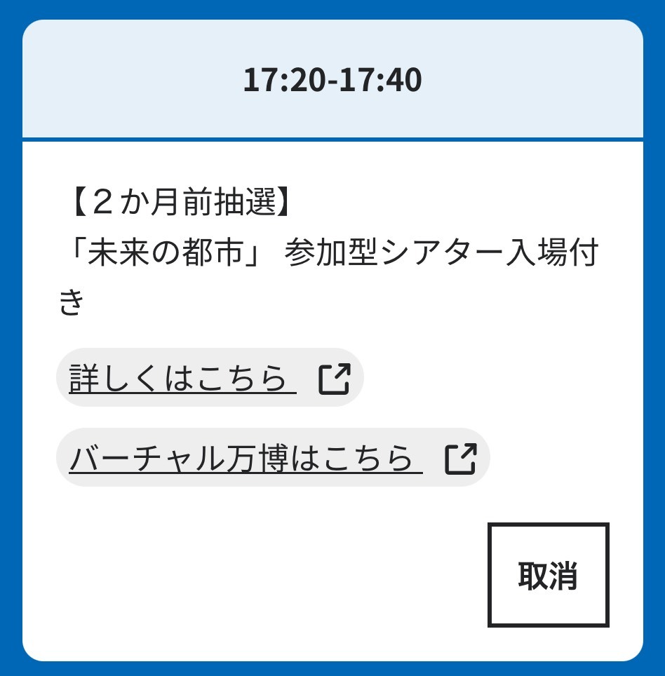 1.公式のチケット受け渡しを利用します。受け取りには万博IDの登録が必要ですので、事前に万博ID登録をお願いいたします。