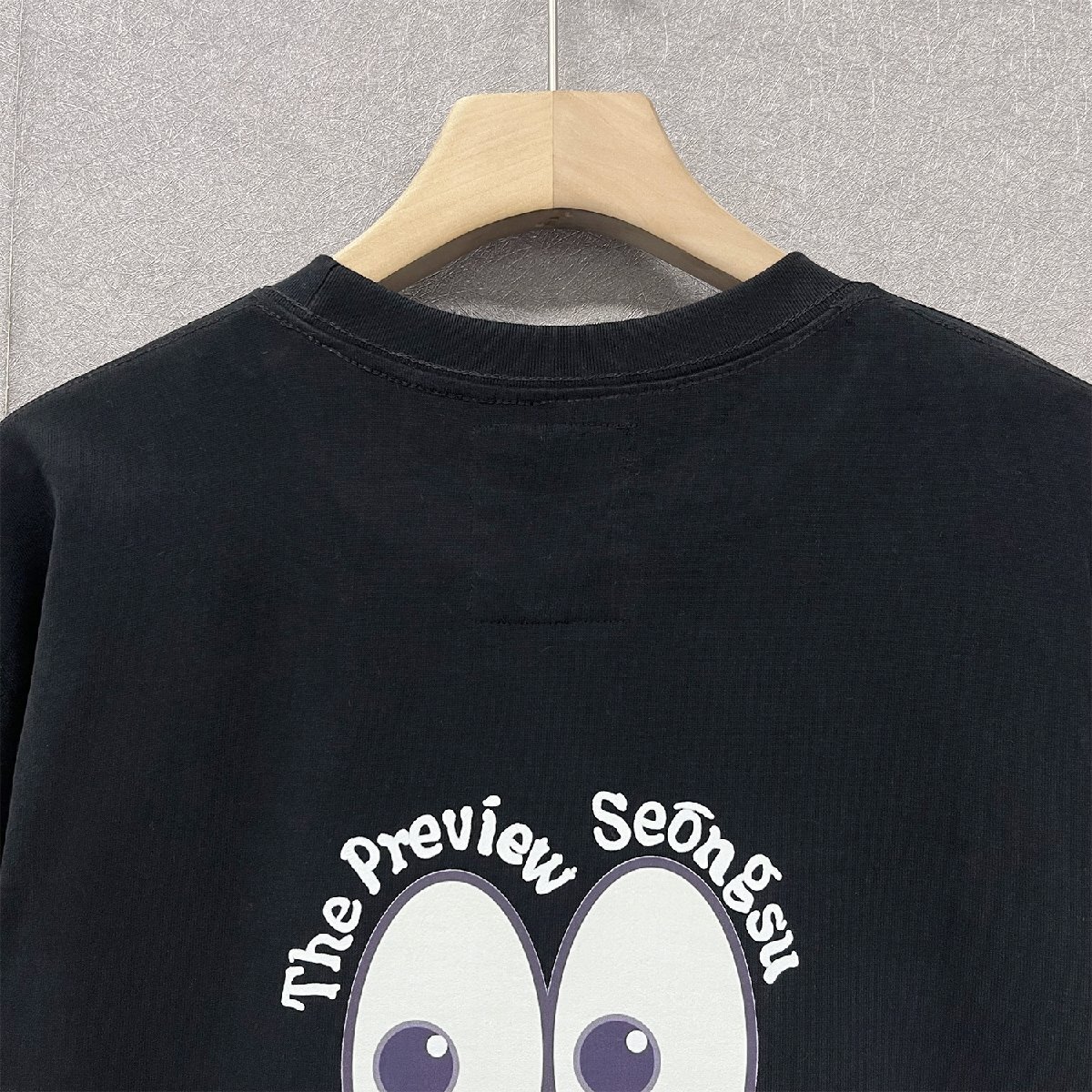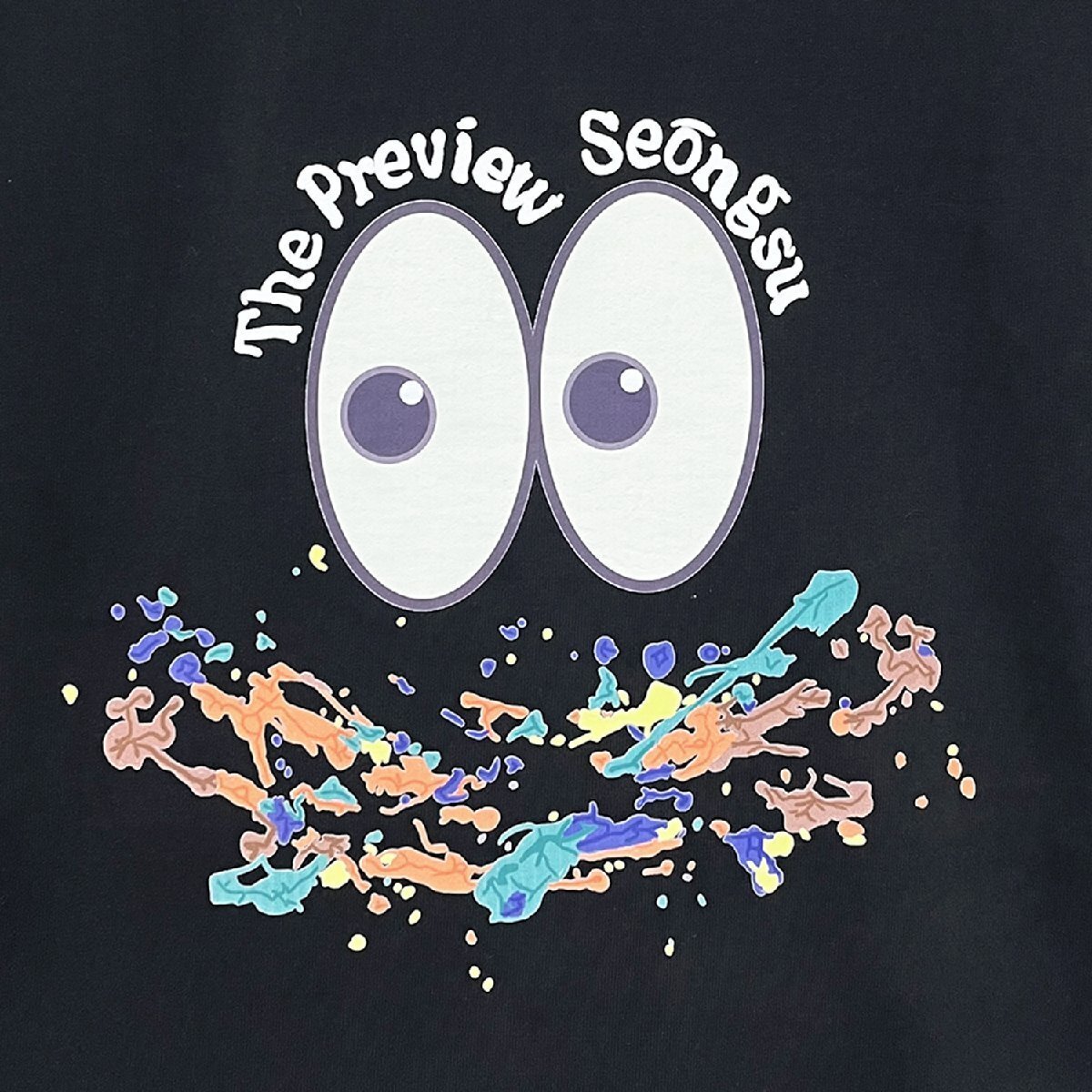 伸縮性の高いリブの首元は、締め付け感を感じにくいのが嬉しいポイント。バックにはカラフルなペイント、大きい目、英字などのプリントをセンス良くあしらい、大人の遊び心たっぷり!周りの目を引いていつもと違う印象を狙う。胸元に配置された可愛い笑顔プリントも魅力点、オシャレな雰囲気やカジュアルさを楽しむことができる。