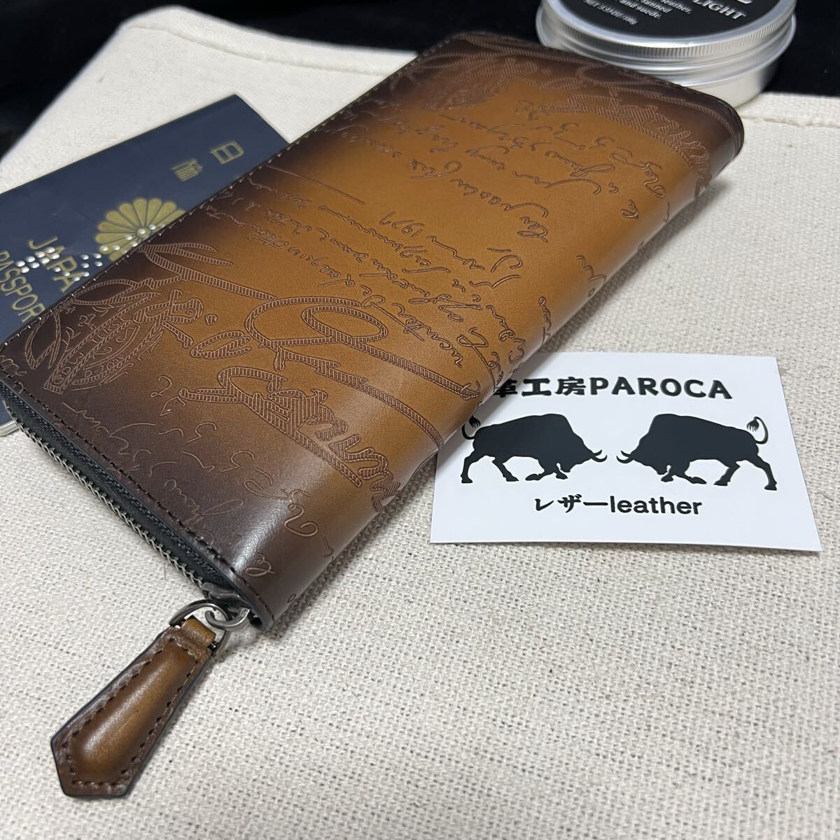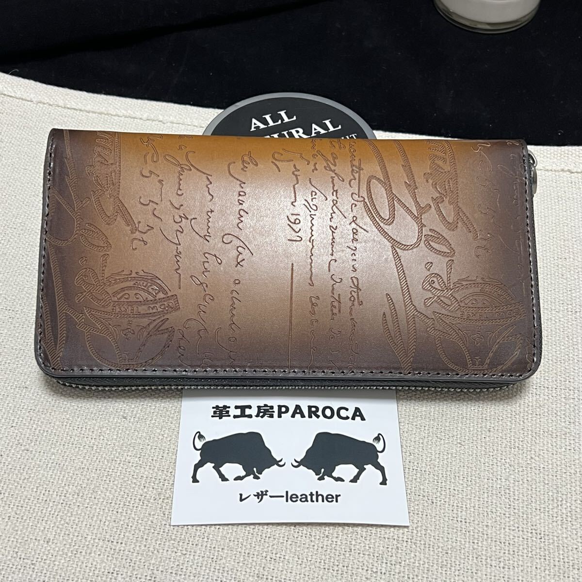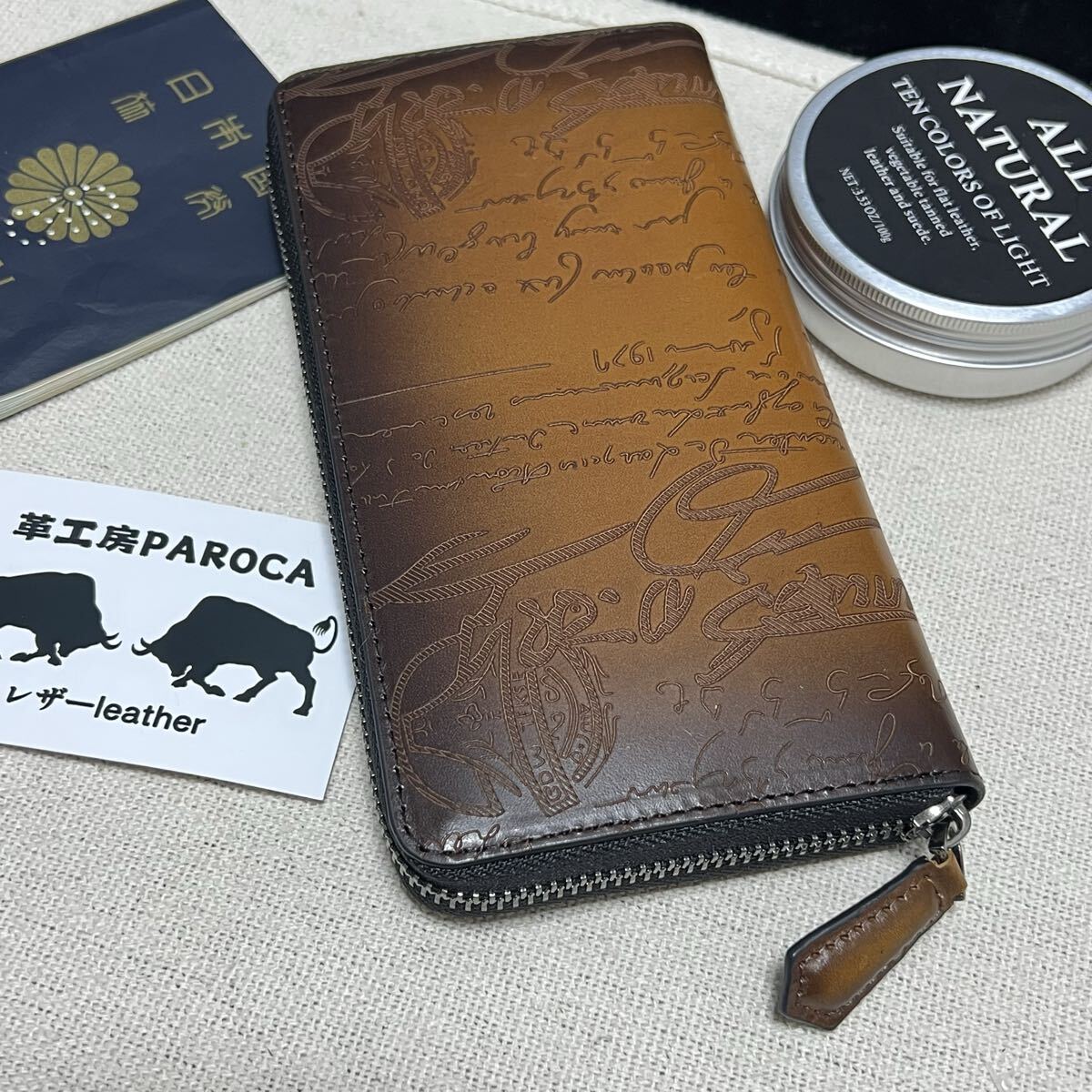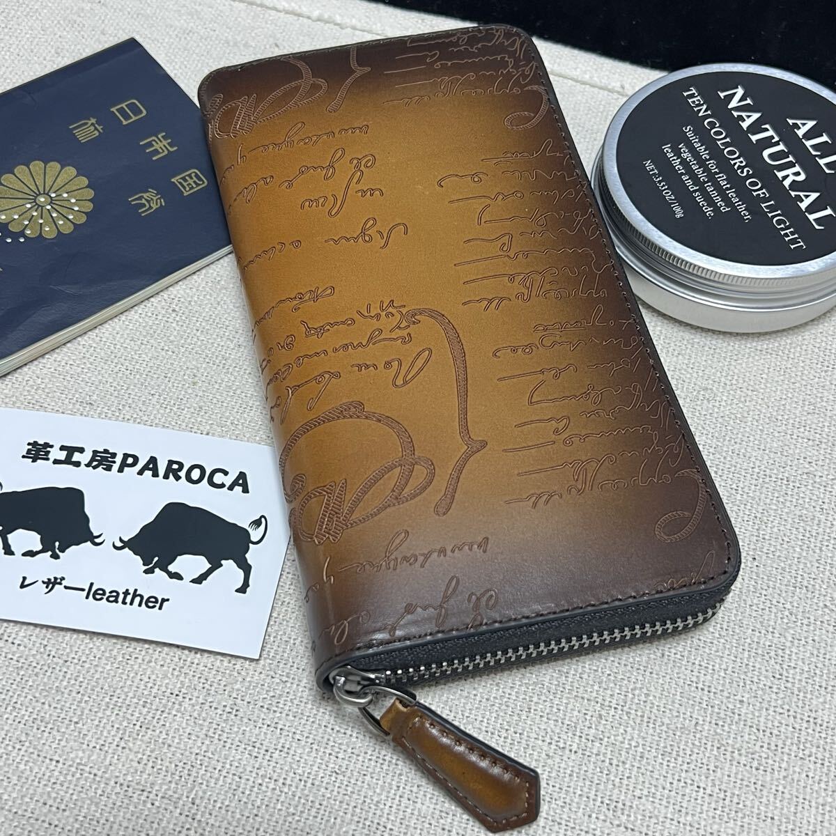 職人が一つ一つの工程にこだわり作り上げた牛革長財布です。手作業で何度も染料を塗り込んだ。一番こだわりの工程はカリグラフィーの彫り込みと革の着色です。使うほどに色合いが増し手に馴染む素材です、使えば使うほど手になじみ、味わいが増していきます。丈夫で風合いが良いです。吸湿性、放湿性、保温性に優れています。