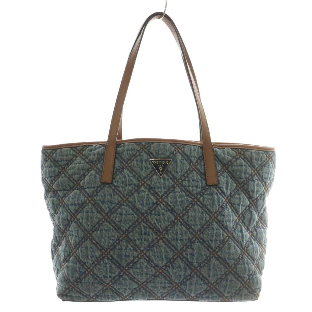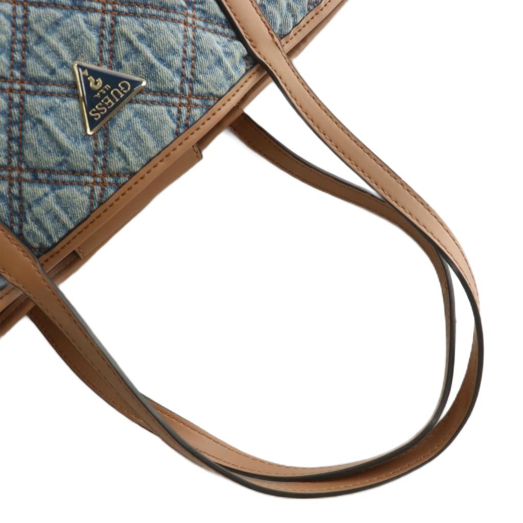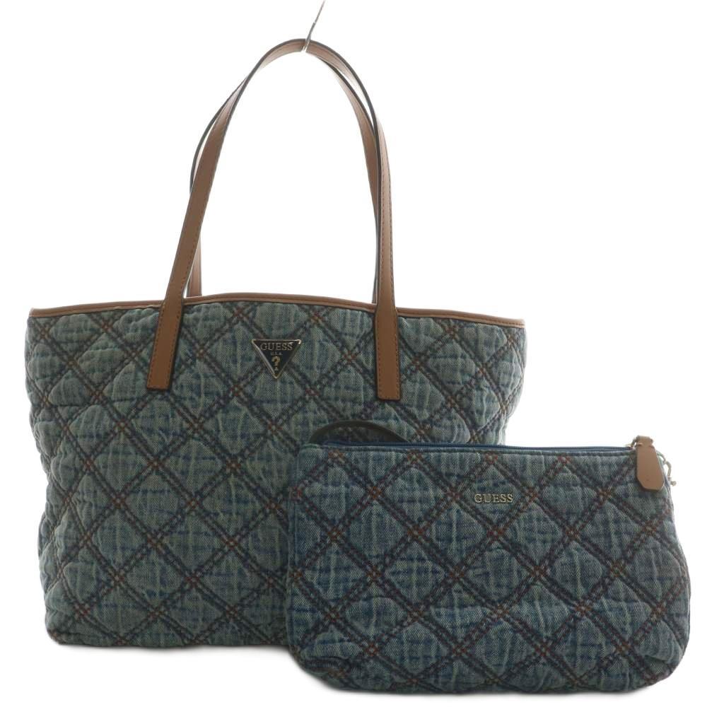 ゲス GUESS トートバッグ ハンド デニム キャンバス レザー キルティング ポーチ付き 三角ロゴ 青 ブルー 茶色 ブラウン
