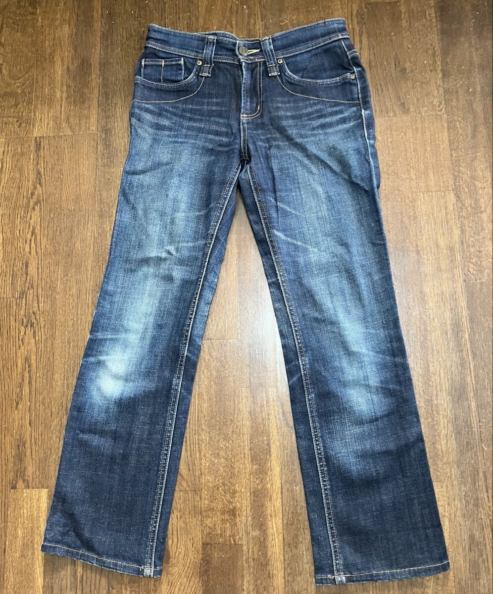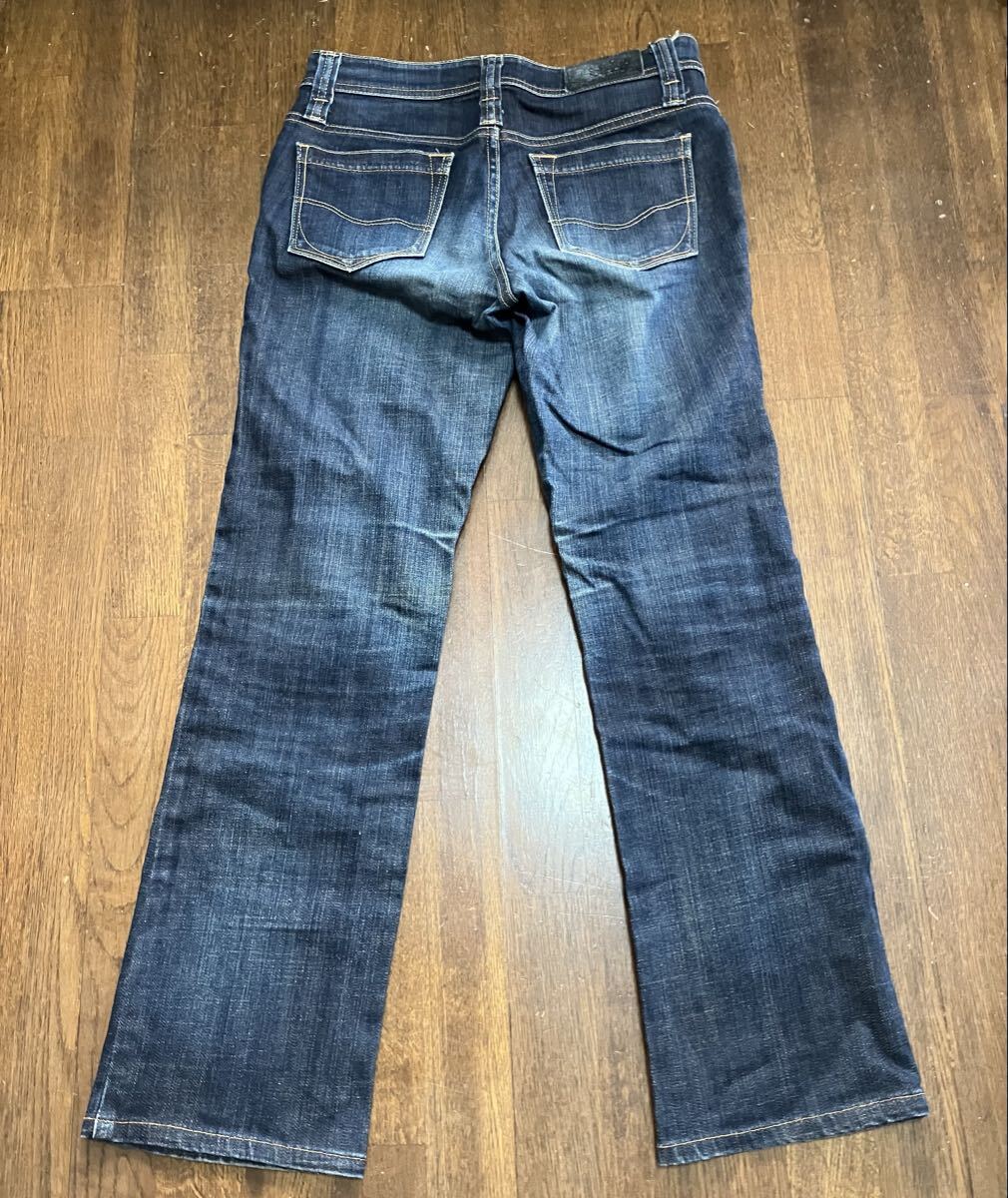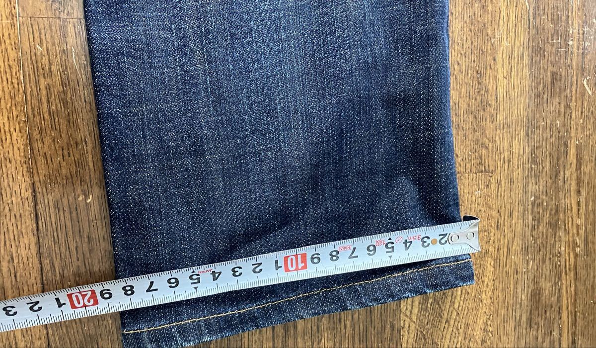 ダークブルーのストレートデニム、4ポケットデザイン。