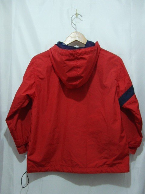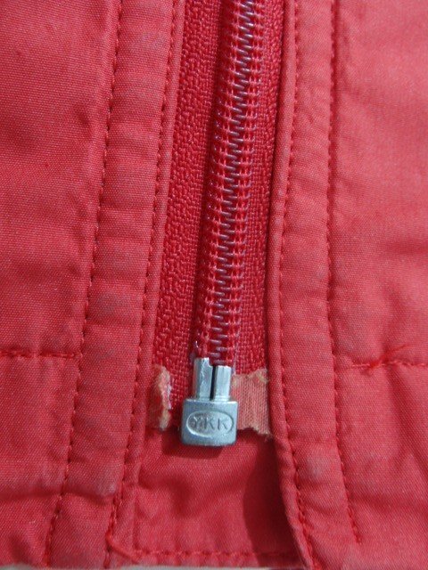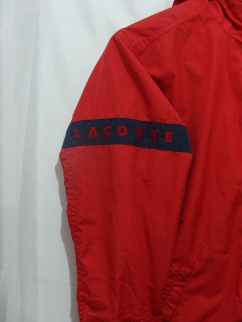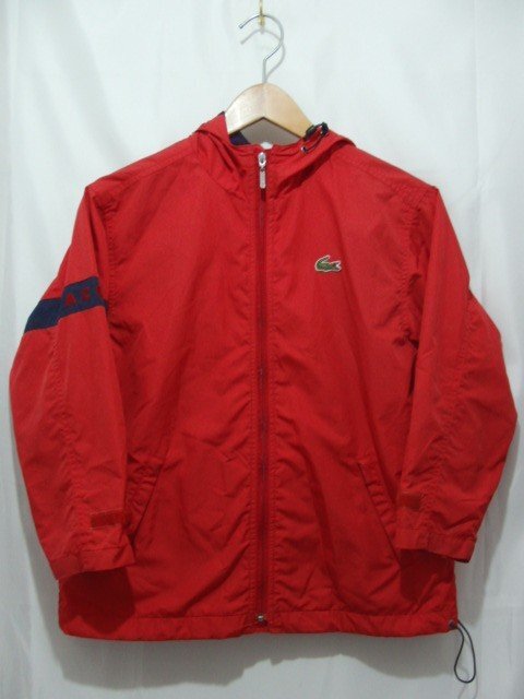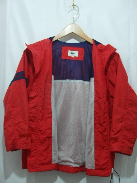LACOSTE ポリエステル フードジップジャケットです。 ファスナー下部に小さな破れ、フロントポケットフラップに軽い擦れがあります。その他、大きなダメージはなく中古並の状態です。 |