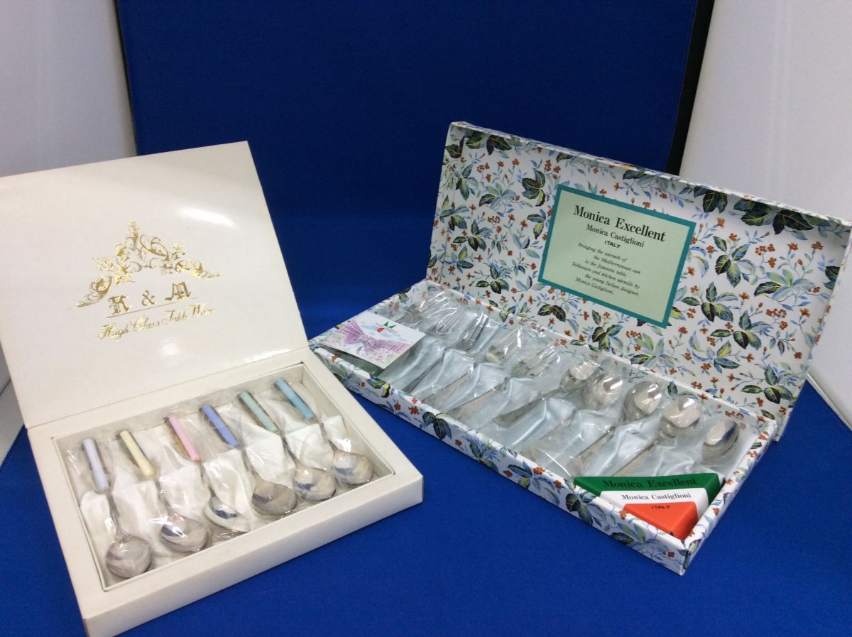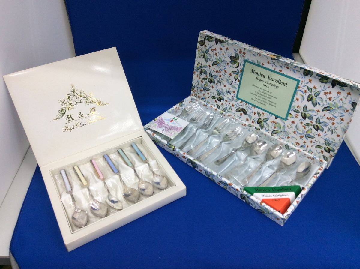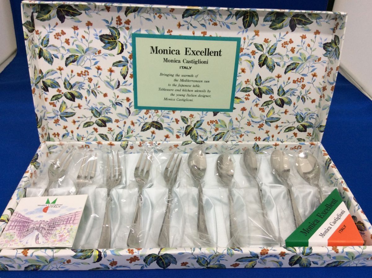 新品未使用 レトロ カラトリー スプーン フォーク ステンレス 箱入り モニカ Excellent ギフト 昭和レトロ テーブルウェア 管50186987