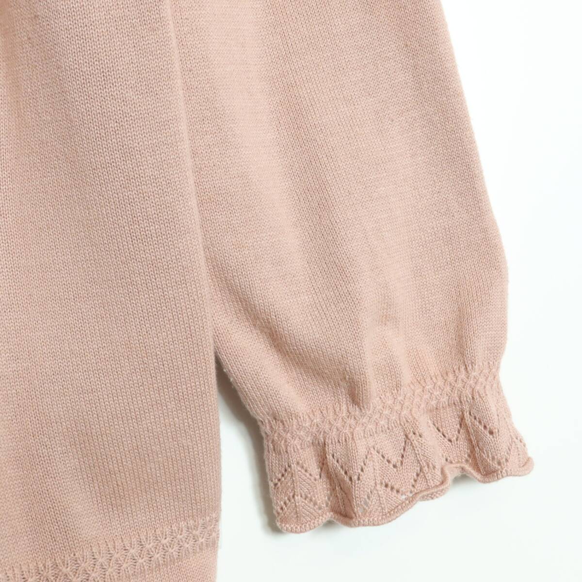 | 商品説明 | 【実寸約】裄丈76後ろ幅38着丈70(cm) 【サイズ表記】 なし。実寸をご参照くださいませ。 【素材】 綿50アクリル50% 【状態】普通の使用感のあるお品物 薄シミ数か所あり 【デザイン】ピンク系 ギャザーたっぷりの長袖ニットカーディガンです。 襟からフロント、裾にかけてふんわりフリル付き フロントはボタンレスで、リボンを3か所結んで留めるデザイン。 |