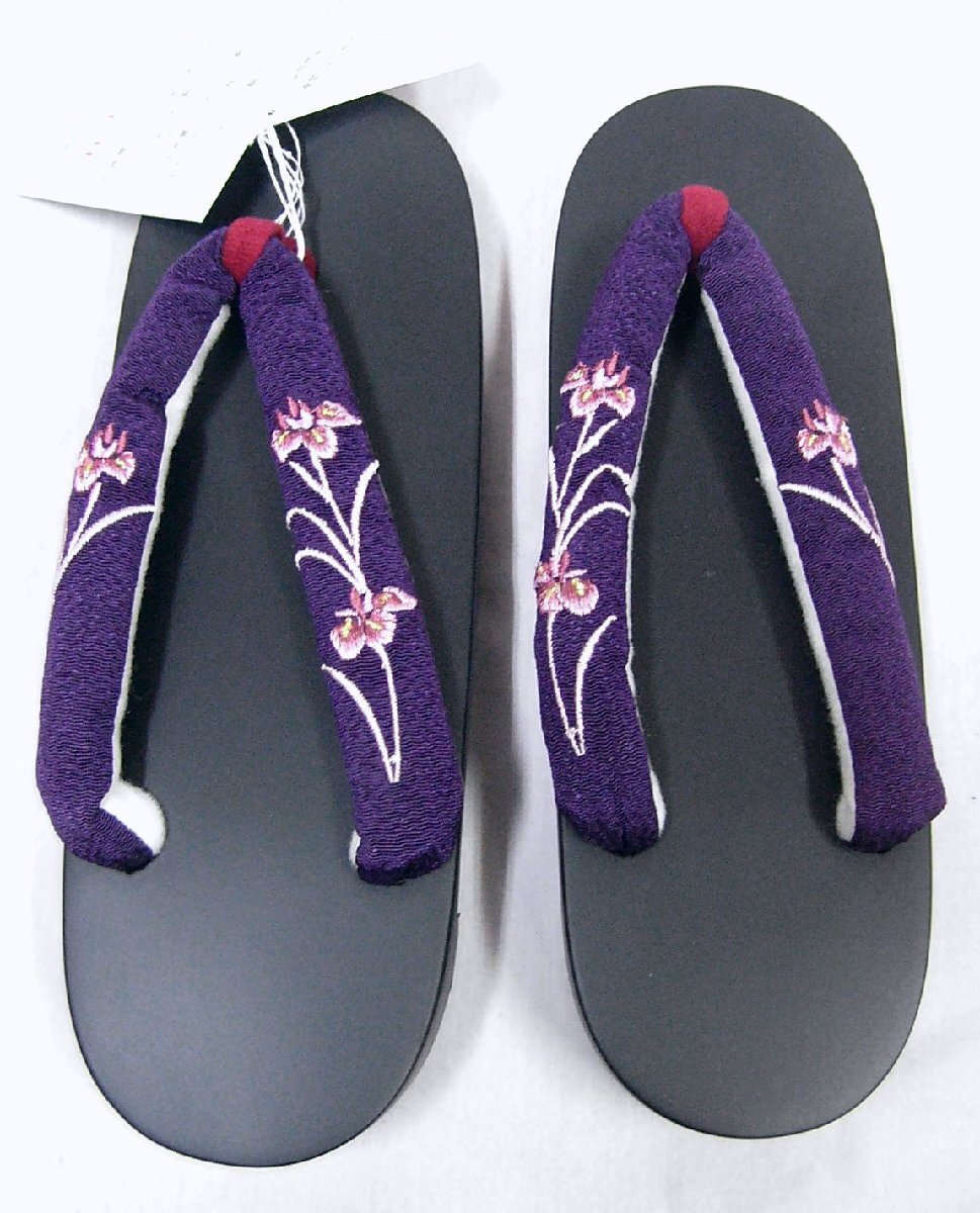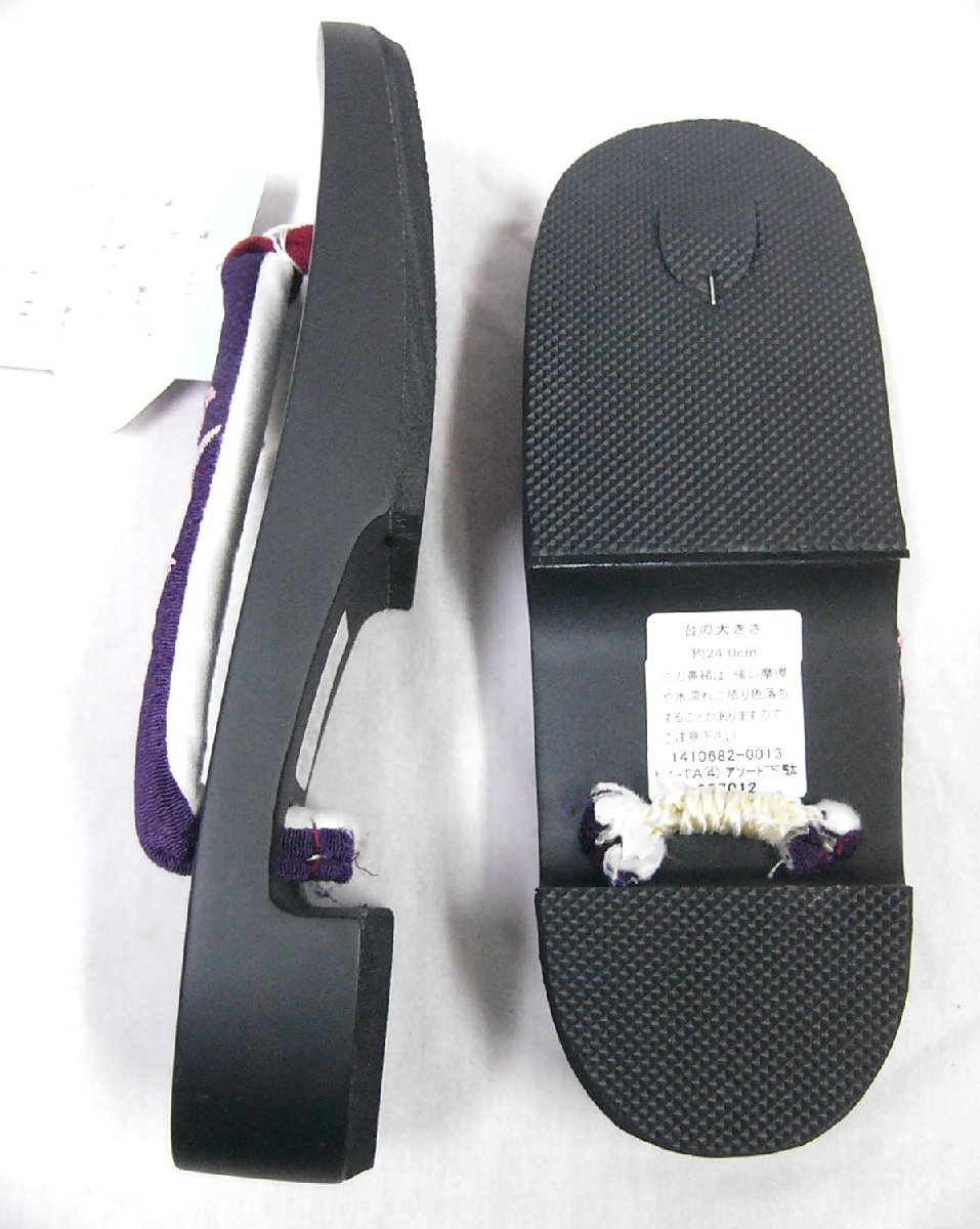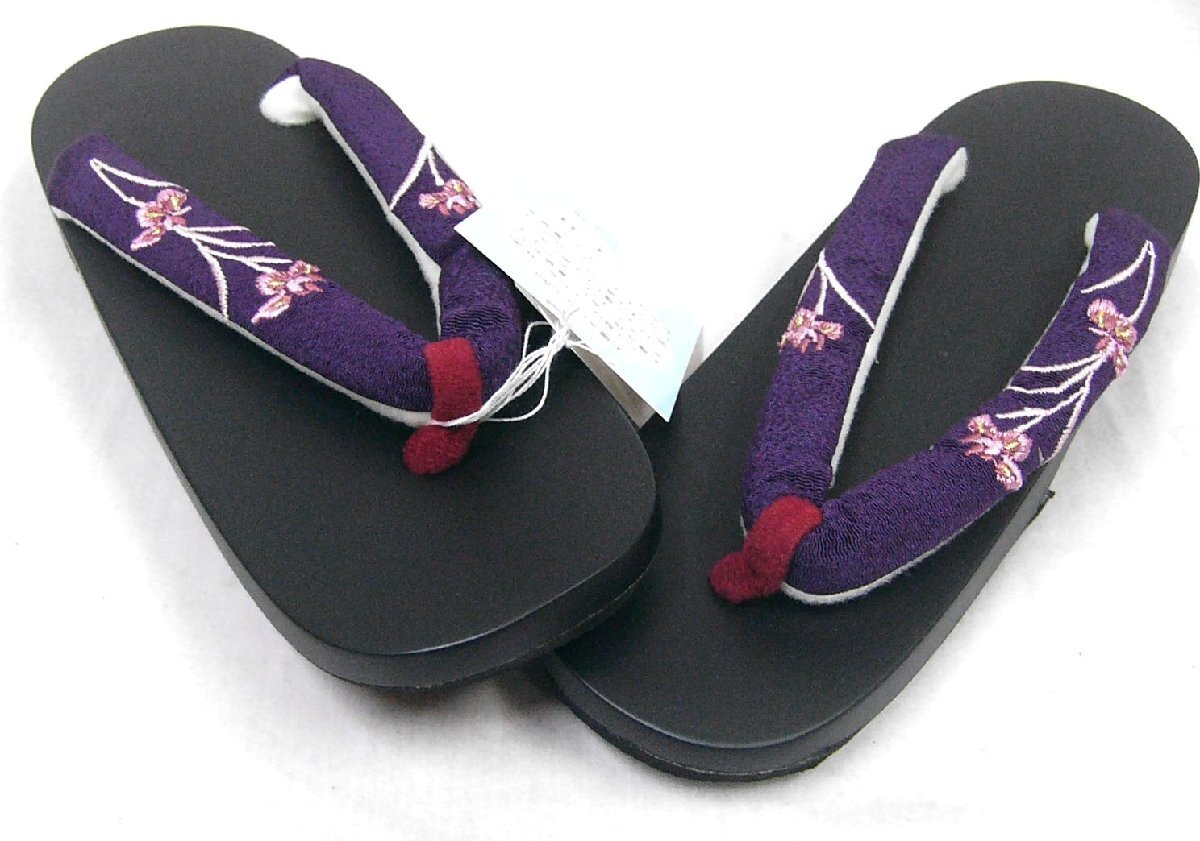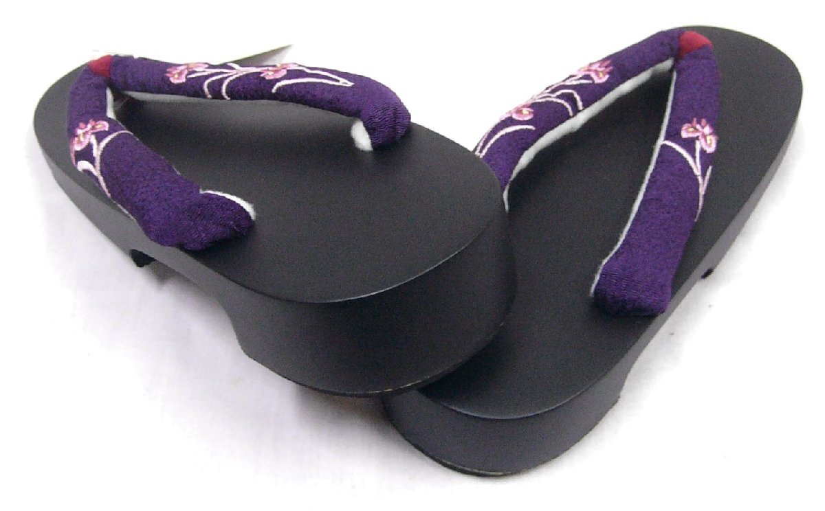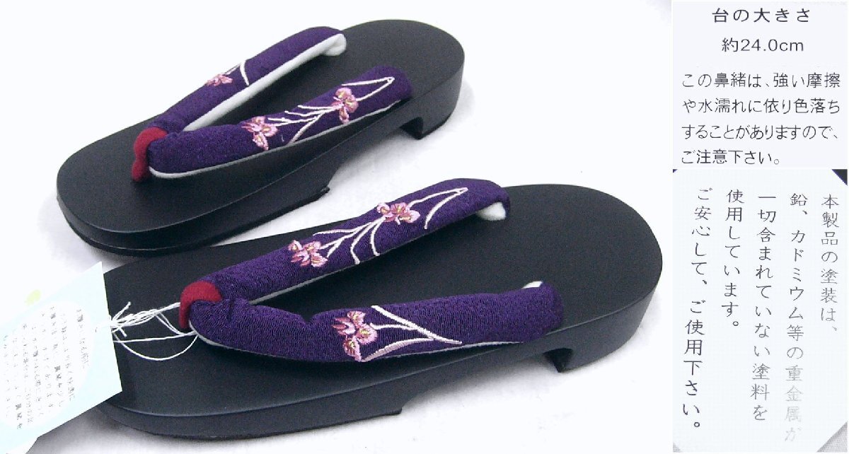 アウトレット 23㎝~24.5㎝の方に 黒色台の下駄 1005 深紫色系刺繍鼻緒 未使用・わけあり品