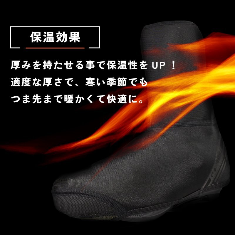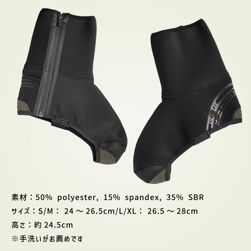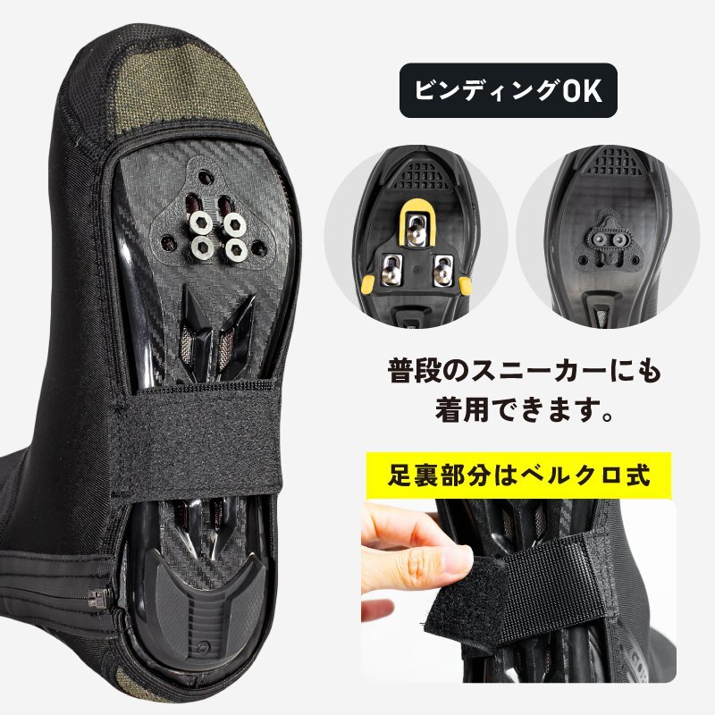 冬の寒い季節に最適な防風・防寒に保温性を兼ね備えたサイクルシューズカバーです。 本体には撥水加工を施してジッパー部分には止水ファスナーを採用。 内側に厚みを持たせる事で保温性の効果を高めます。 足裏部分はベルクロ式、サイドは全開するファスナーで簡単に着脱できる便利な真冬の必須アイテム。 ビンディングシューズ対応、また通常のスニーカーなど様々なシューズに使えます。 自転車通勤や通学、サイクリングなど冬の時期の冷え防止に最適な防寒サイクルシューズです。 ロードバイクやクロスバイク、mtbなどの自転車やバイクなどのツーリングシーンに。 [つま先まで保温] 冬のサイクルライドで辛い足の冷え対策に最適なシューズカバー。 最も冷えるつま先から足首上まで保温しカバー。 冬の冷たい風や冷たい雨を防ぎます。 寒い季節でも快適にサイクルライドを楽しめます。 [保温効果] 厚みを持たせる事で保温性をUP! 適度な厚さで、寒い季節でもつま先まで暖かくて快適に。 [防風効果] 冷たい風をガードします。 風を受けて体が冷えるのを軽減します。 [伸縮性] スパンデックス素材を使用しているので弾力性があり、 伸縮性に極めて優れています。脱着しやすい。 [日常撥水レベル] 全体に撥水加工を施し短時間の弱い雨などに耐えれます。 防水ファスナー採用し隙間から入る水の侵入を阻止します。 ※撥水加工で完全防水ではございません。 [簡単脱着] クリートをつけたビンディングシューズでもお使いいただけます。 またサイクルシューズ履いたまま着用可能。 足裏部分はベルクロ式、サイドは全開するファスナーで簡単に着脱できる。 [耐久性] 擦れやすいつま先とかかとには耐摩耗素材を採用。 地面と接する生地はタフに。 [シューズカバー] 普段のスニーカーにも着用できます。 寒い時期のキャンプやレジャーなどにもおすすめです。 商品内容自転車用サイクルシューズカバー 素材50% polyester, 15% spandex, 35% SBR サイズL/XL: 26.5~28cm 高さ約24.5cm ※手洗いがお薦めです ・商品は入荷によりキズがある場合があります。 その場合、保証対象外になりますのでご了承お願い致します。 ・ディスプレイ環境により実物と色が異なる場合が有ります。 ・入荷時期により予告無く一部仕様変更する場合が有ります。 |