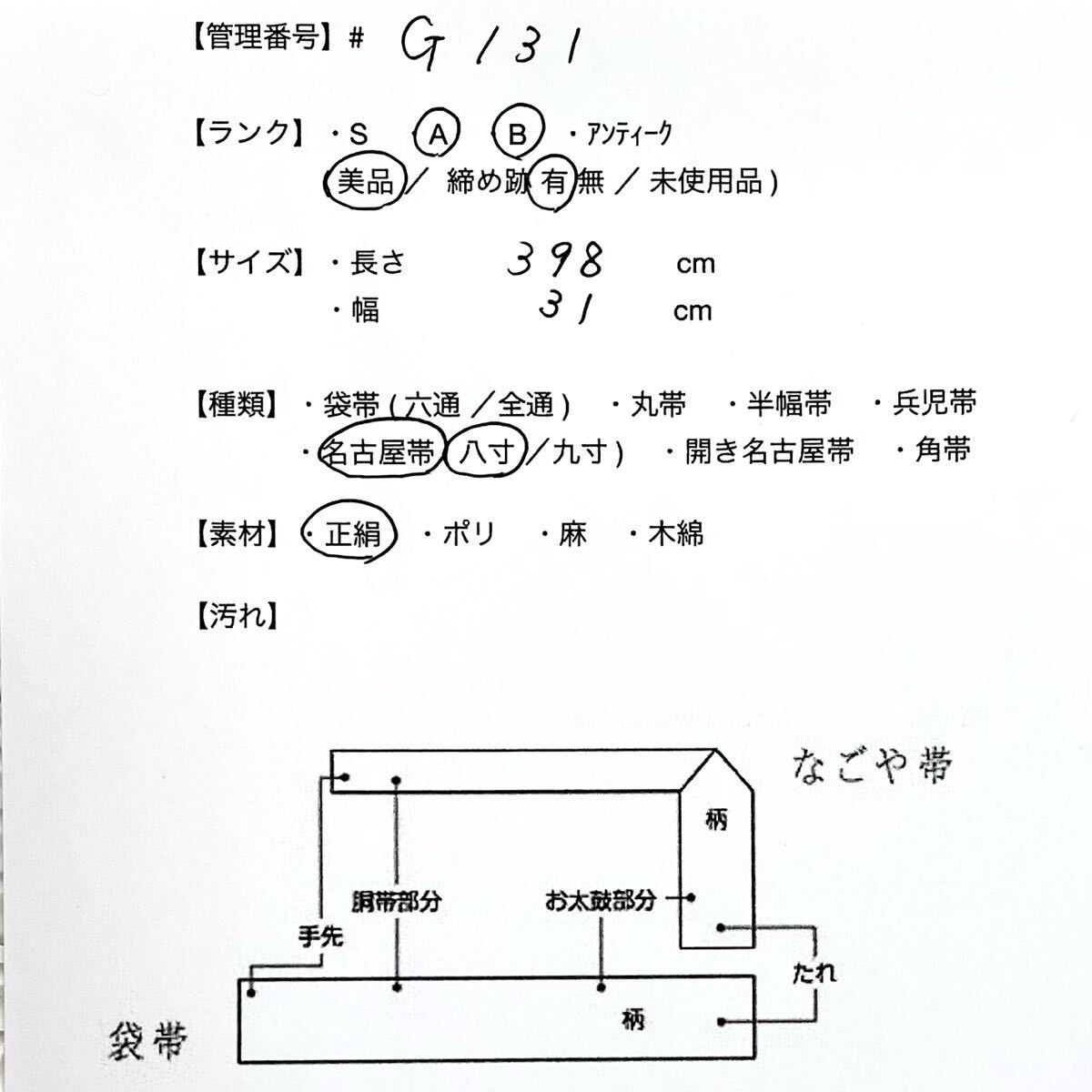 ・花織調のとても素敵な八寸名古屋帯です。 ・締め跡は少しあります。 ・特記する汚れやシミもなく、状態がとても良いです。 ・すぐにでも着用していただますので、おすすめの帯となっております。 ・お安く出品致しますので、是非この機会にいかがでしょうか。 |