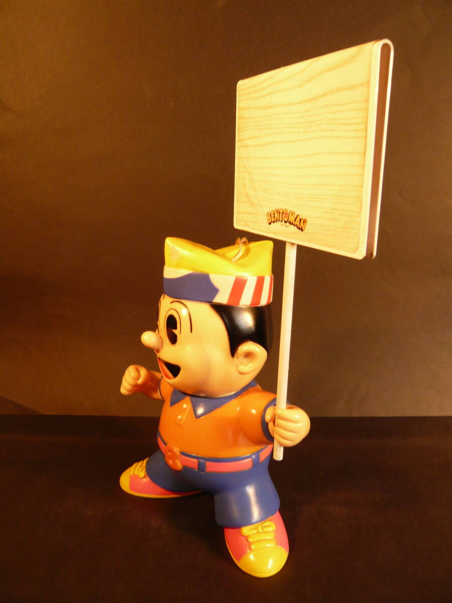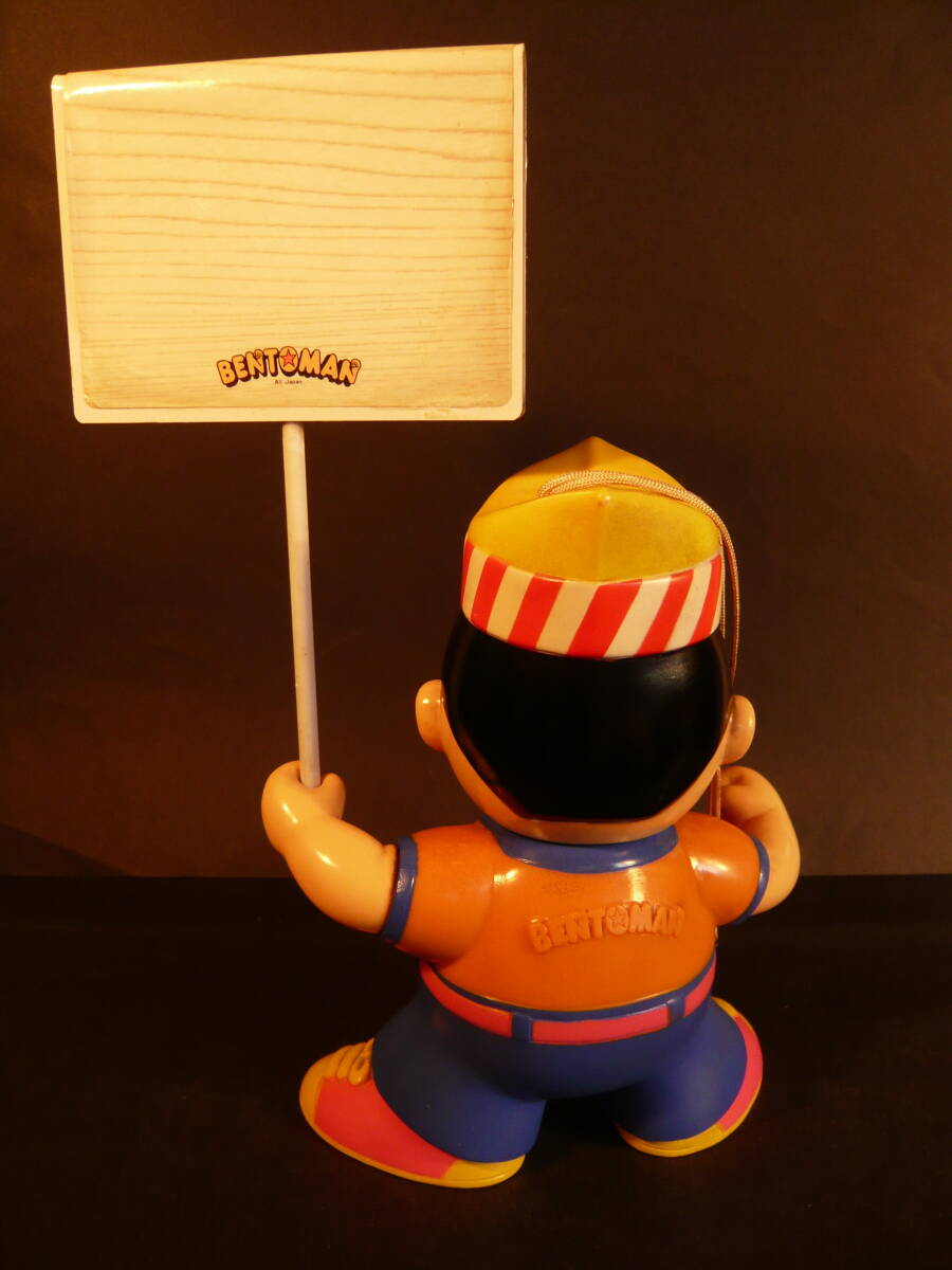 看板を手に持った状態での高さは、約27.5センチ。 ベントマン自身の高さは、18.5センチ、幅約15.5センチ、奥行き約8センチです。発送の際は、看板を外した状態で梱包します。