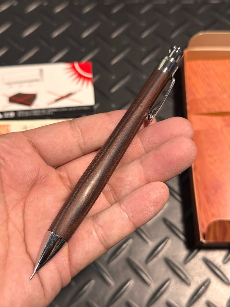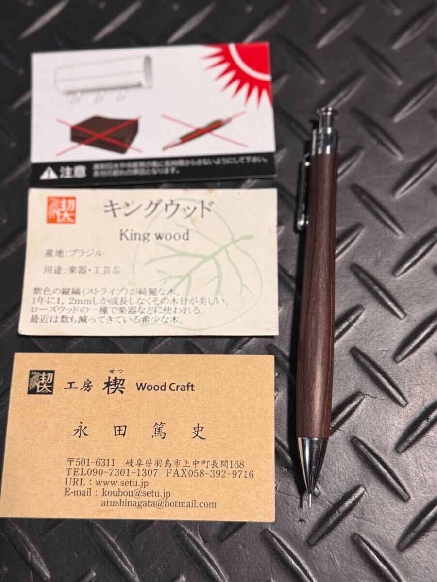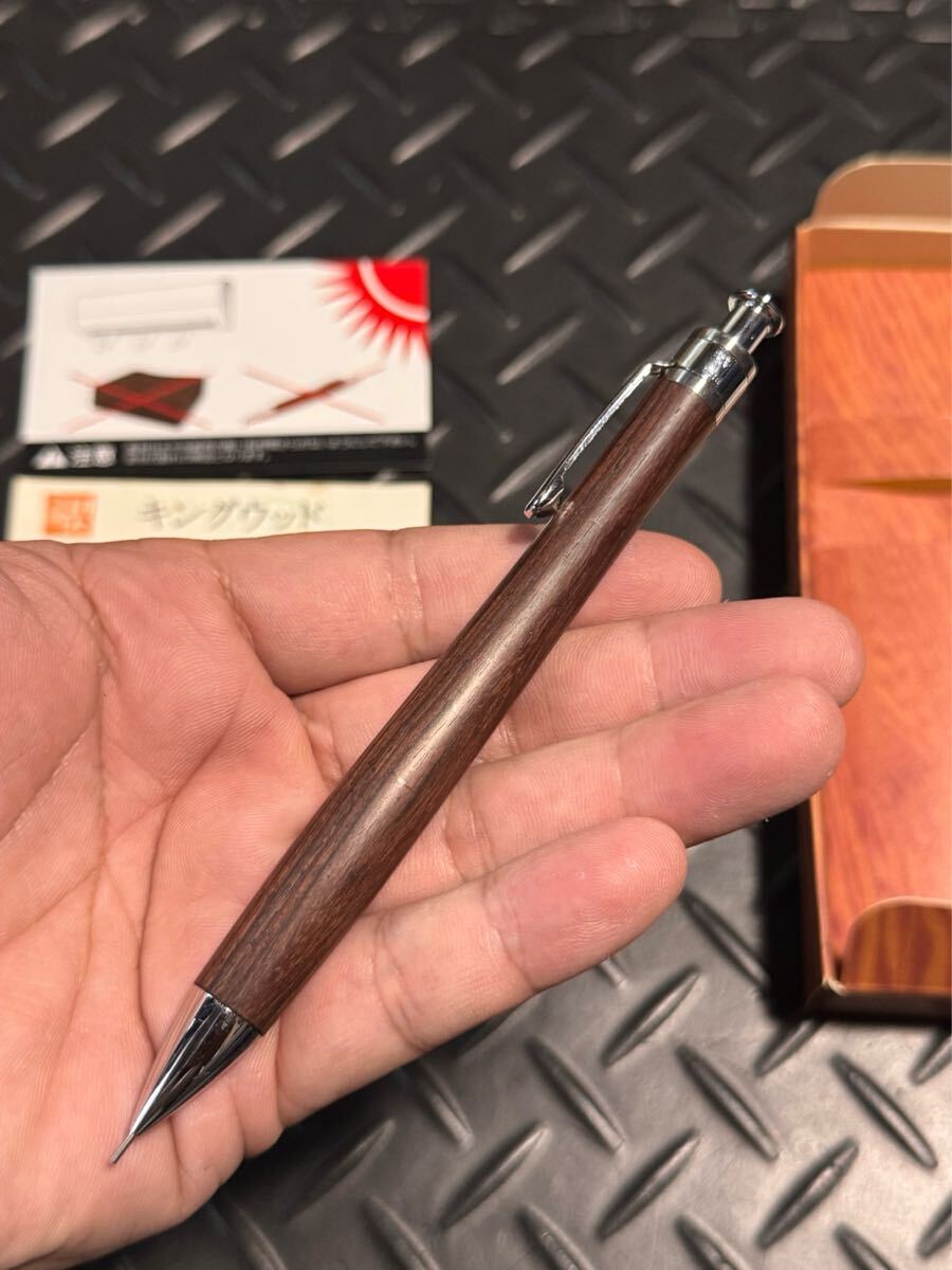 工房楔のシャープペン ペンシル楔です。 樹種:キングウッド 芯径:0.5mm 使用頻度はメモ書きに使った程度で、毎日ガシガシと使ってたわけではないので状態も綺麗です。 目立った傷、汚れ等はありませんが、元々クリップの当たっている位置に凹みがあります。 中古品ですので、ご理解の程お願い致します。