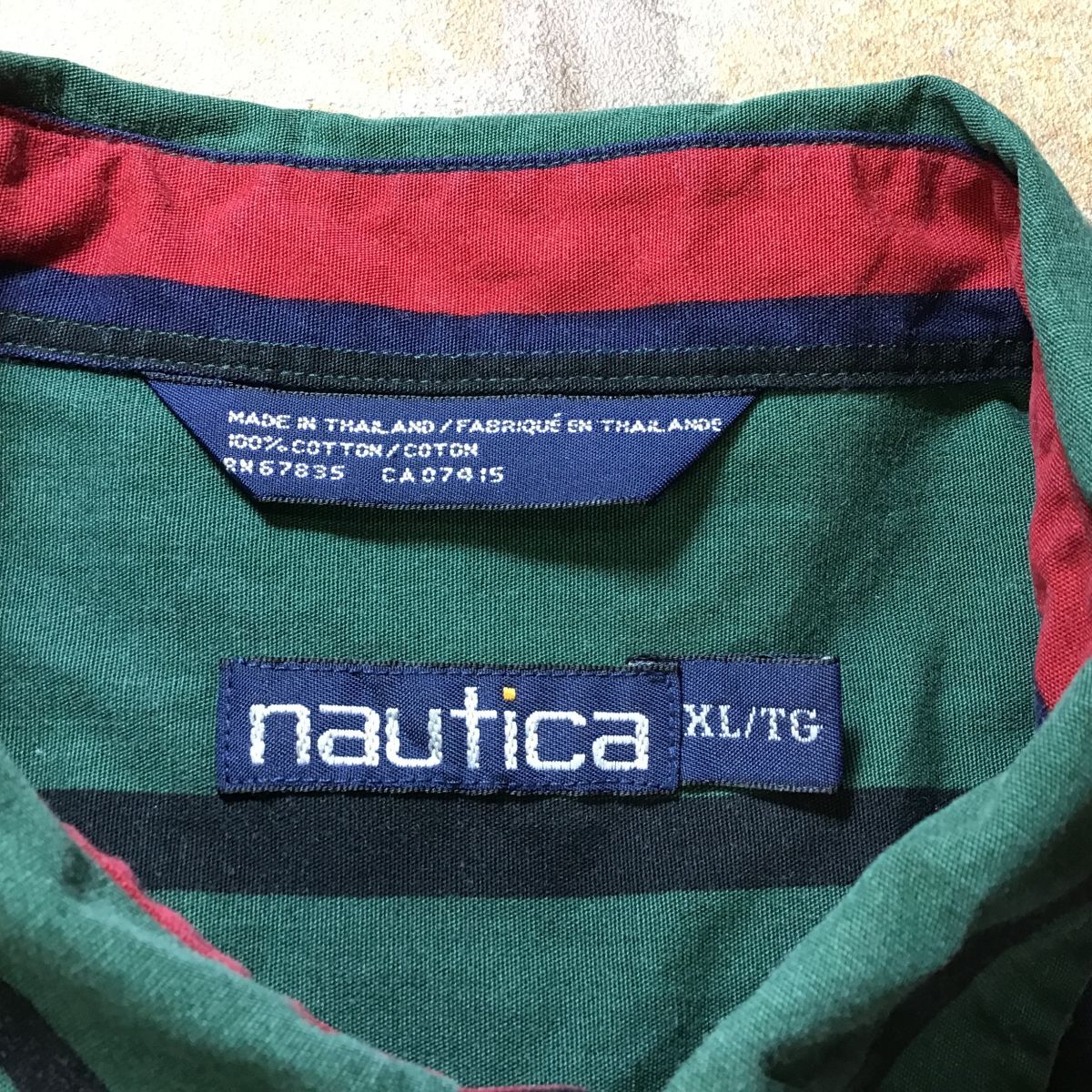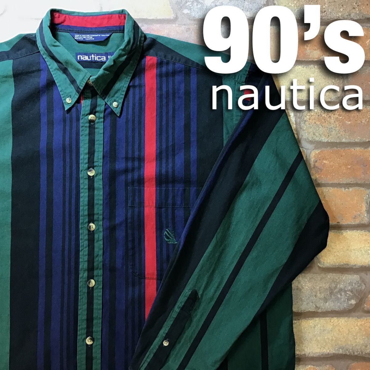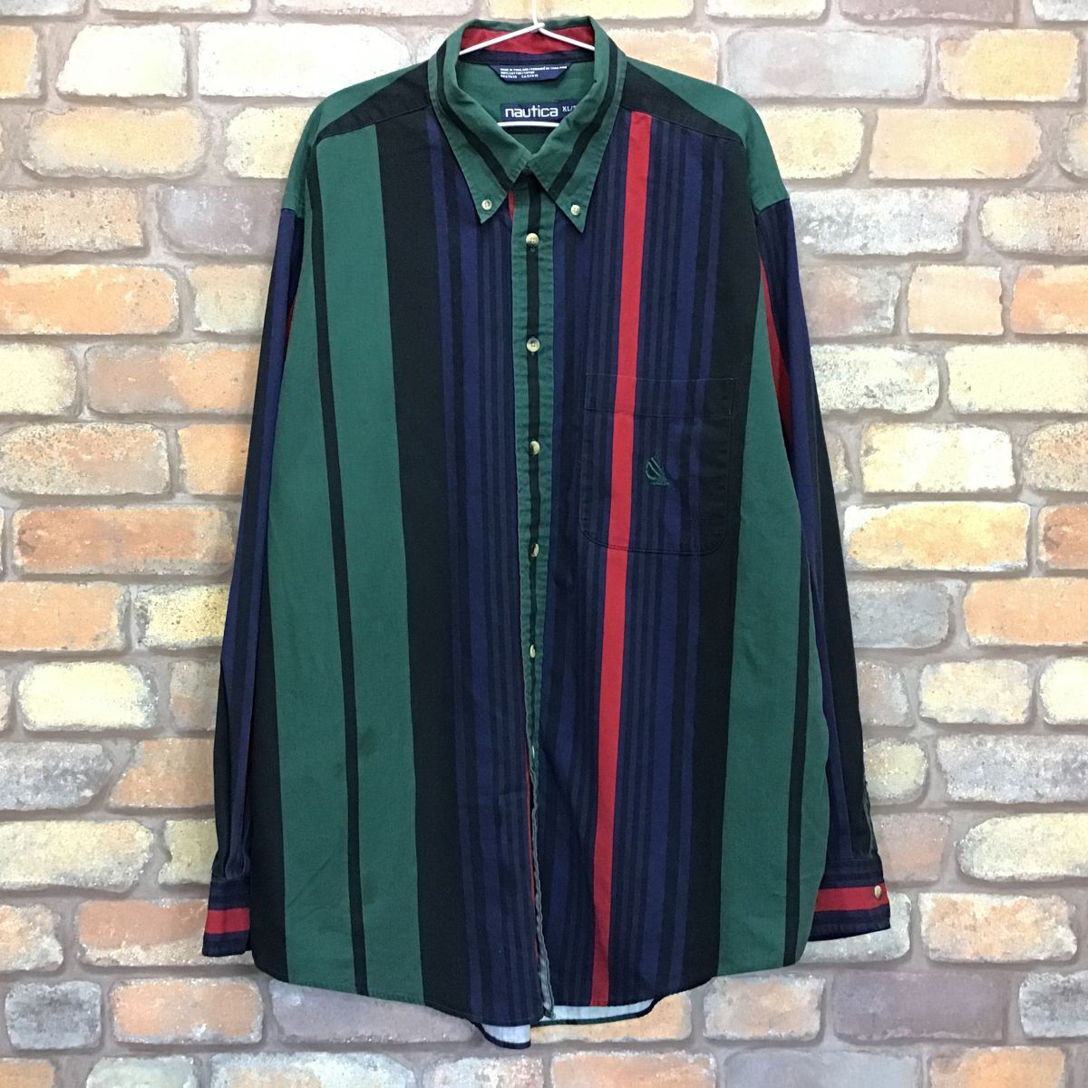 ★レア★BIGサイズ★90’s vintage★【nautica ノーティカ】刺繍 旧ロゴ マルチストライプ BDシャツ[海外 XL]黒 緑 赤 紺 ゆるダボ K3-124