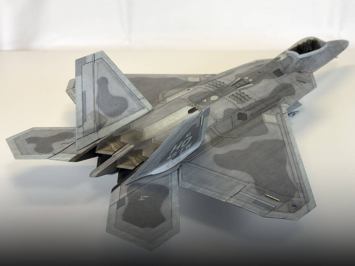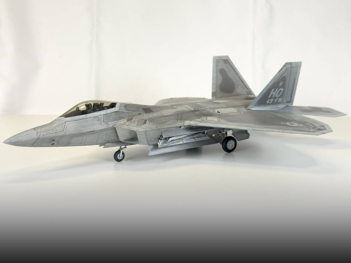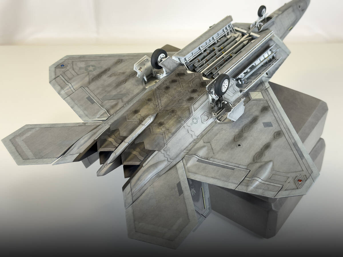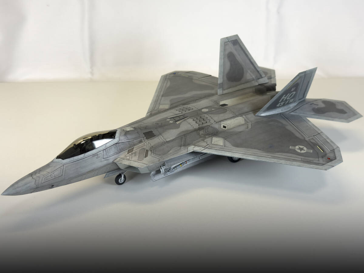 この度は当オークションを御覧いただき、ありがとうございます 本商品は、 【ハセガワ】1/48 F-22 ラプター を、各部改修工作したキットです 画像検索すると、実機はかなりステルス塗装が劣化・リペアしてあったので、質感を再現しています ■作業内容 ◯ 基本工作(バリ取り・合わせ目処理・ヒケ処理) ◯ 黒サフをベース塗装後に機体各部をパネルライン毎にグラデーション塗装 ◯ エナメル塗料でウォッシング処理後に、オイル汚れや塗膜劣化部分等を油彩等各種マテリアルにてリアルウォッシング ◯ ツヤ消しクリアにてオーバーコート ■サイズ(参考程度) ◯ 1/48スケール ◯ 全長:405mm ◯ 全幅:285mm ◯ 全高:100mm ※ 撮影時に脚部下に噛ましているプラ製透明ケースを同梱します ※ 商品の元箱・取扱い説明書は含まれません |