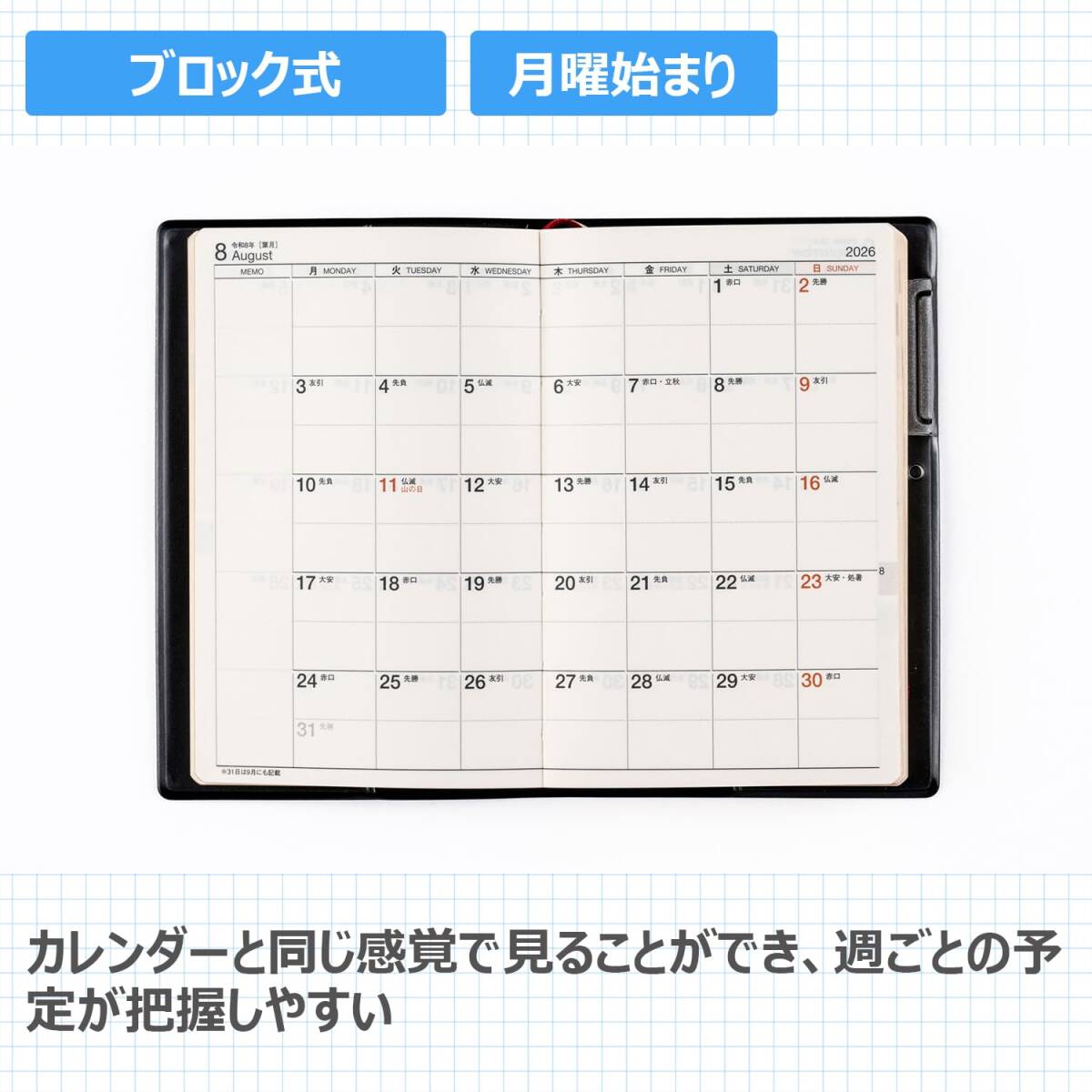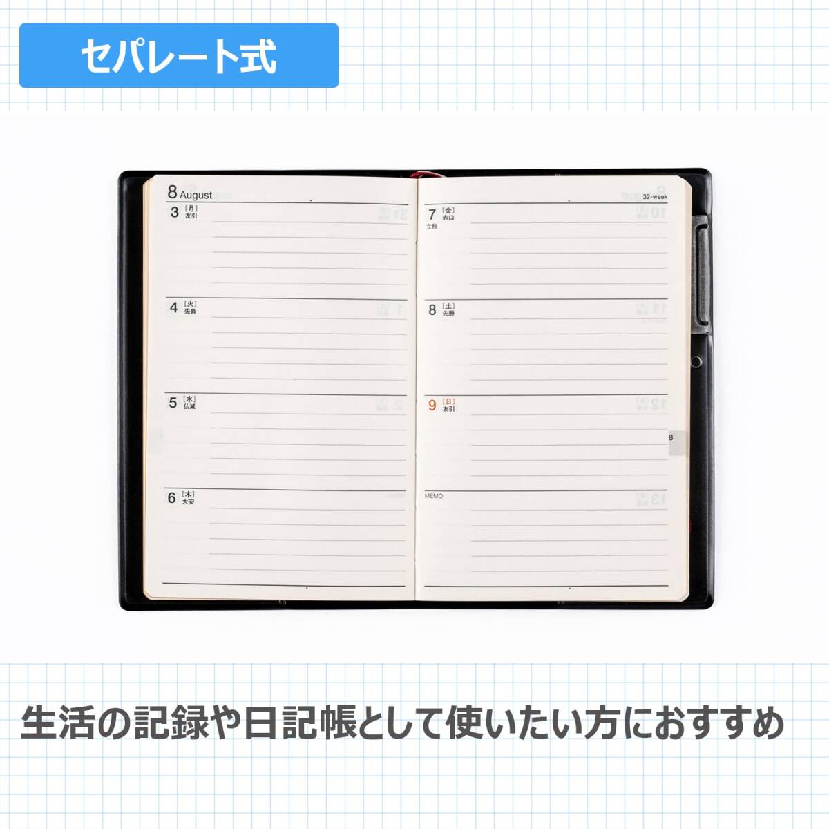 【商品詳細2】表紙タイプ:皮革調 ●刷色:2色刷 ●ページ数:176頁 ●スペック:ペンホルダー ●付録:年齢早見表 ●別冊:,横ケイメモ,方眼メモ,切り取りメモ
