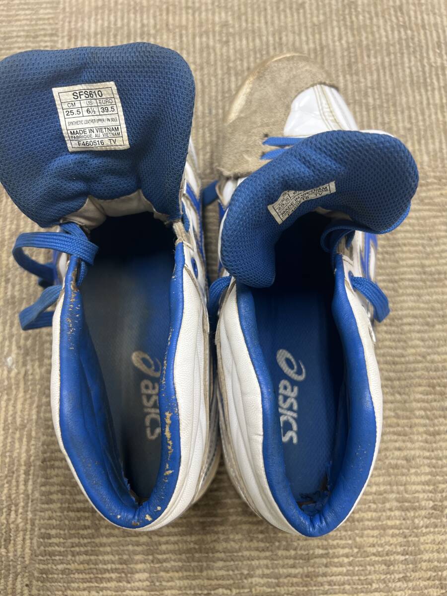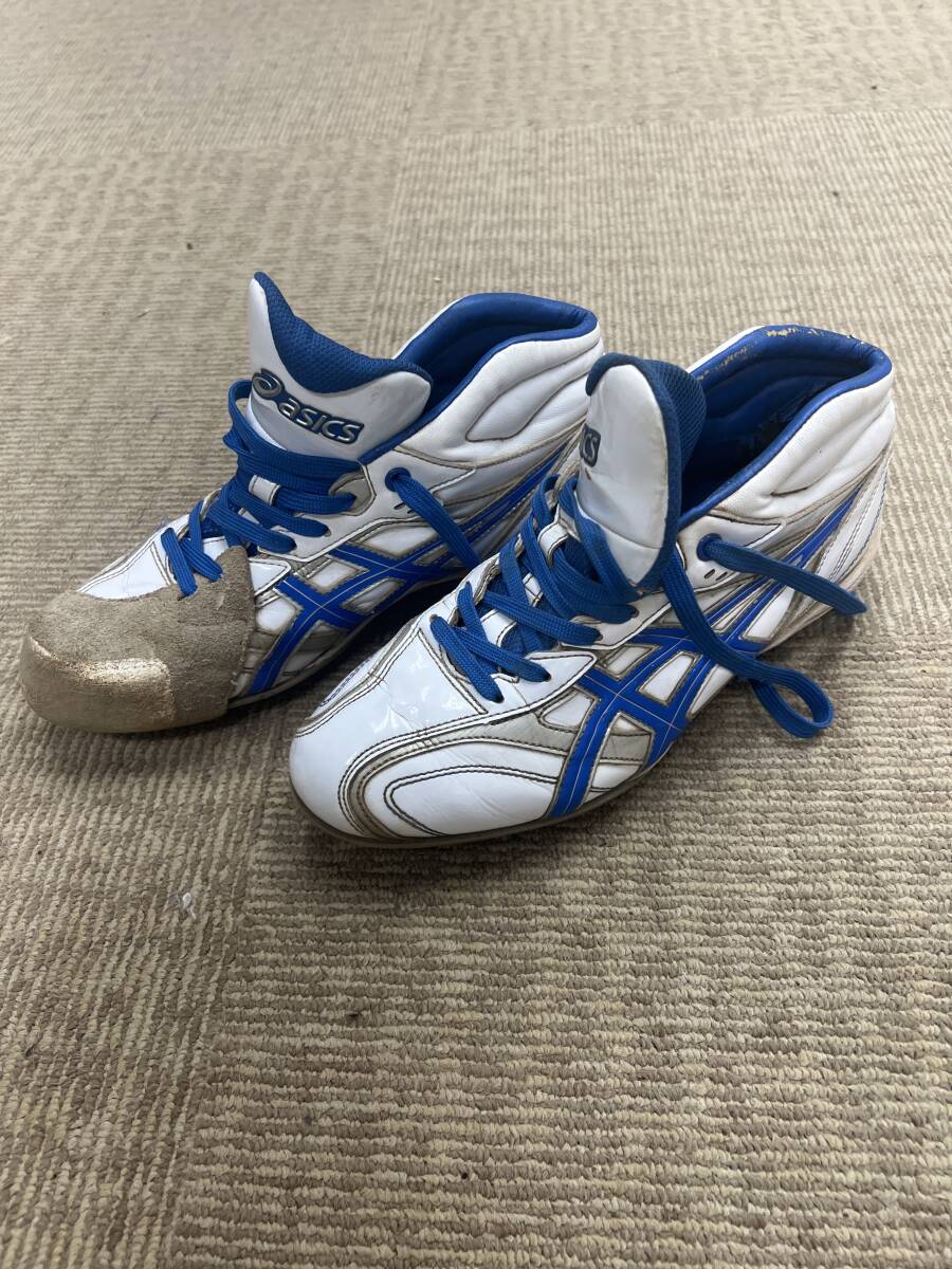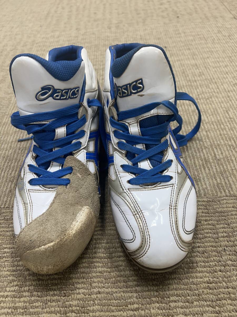 社会人野球で使用 アシックスミドルカット金属製スパイク サイズ25.5cm カラー白青ライン 汚れ、傷あり。破れ無し。USEDを理解できる方の入札をお願いします