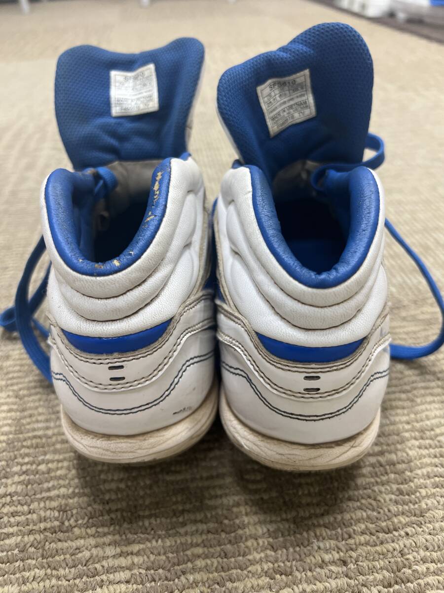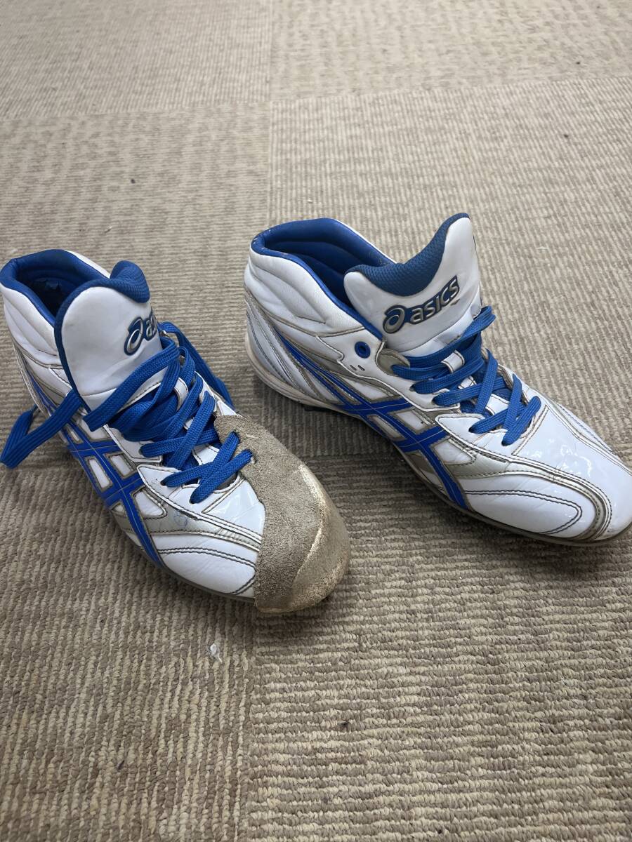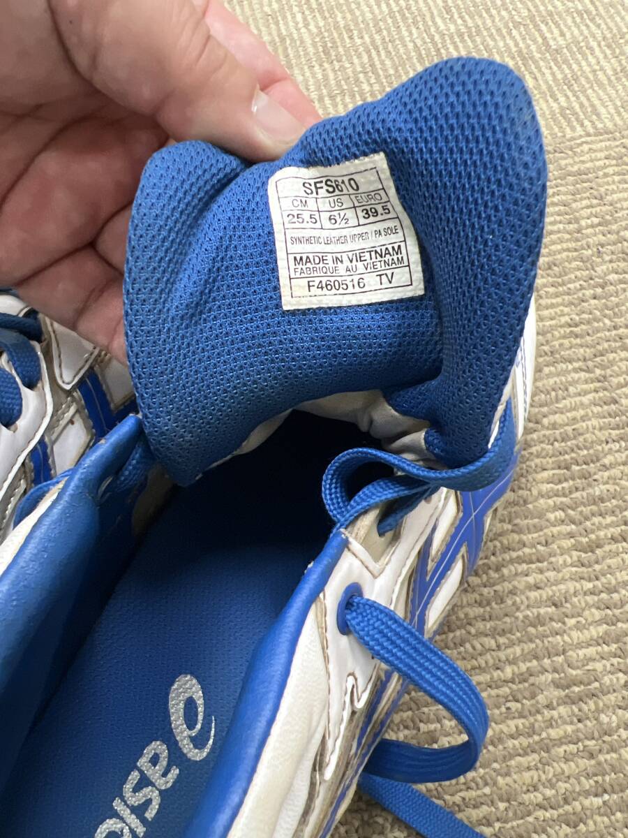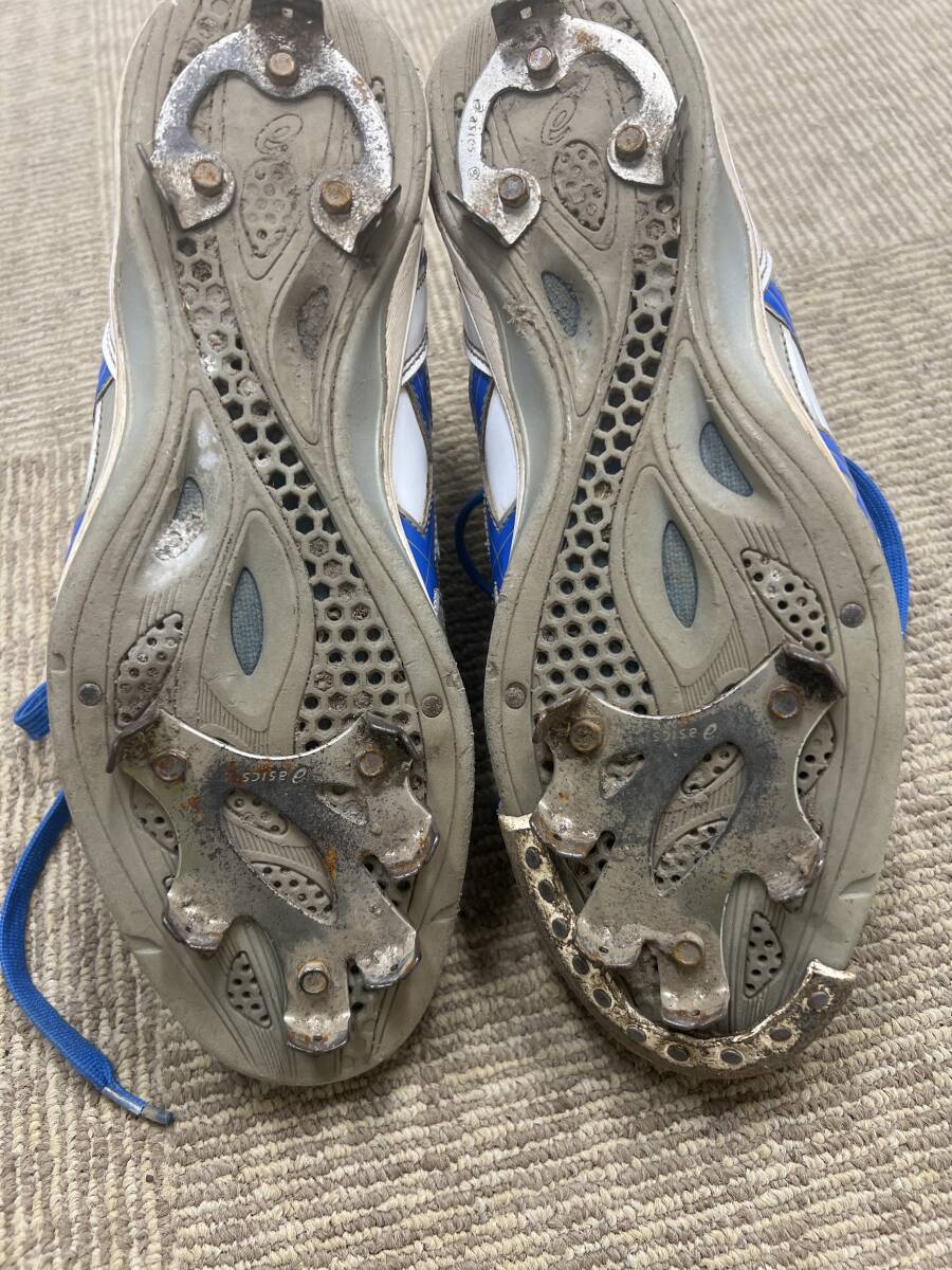 社会人野球で使用 アシックスミドルカット金属製スパイク サイズ25.5cm カラー白青ライン 汚れ、傷あり。破れ無し。USEDを理解できる方の入札をお願いします