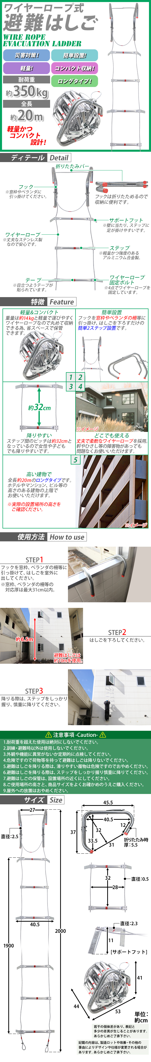 | 商品名 | 送料無料 避難はしご 折りたたみ 全長約20m 耐荷重約350kg ロング 梯子 はしご 防災用品 防災グッズ もしもの時の 緊急避難はしご 避難用はしご 縄はしご 非常はしご 防災 フック ワイヤーロープ ワイヤー マンション ビル 緊急 災害 地震 火災 軽量 避難 hinanhashigo20m |