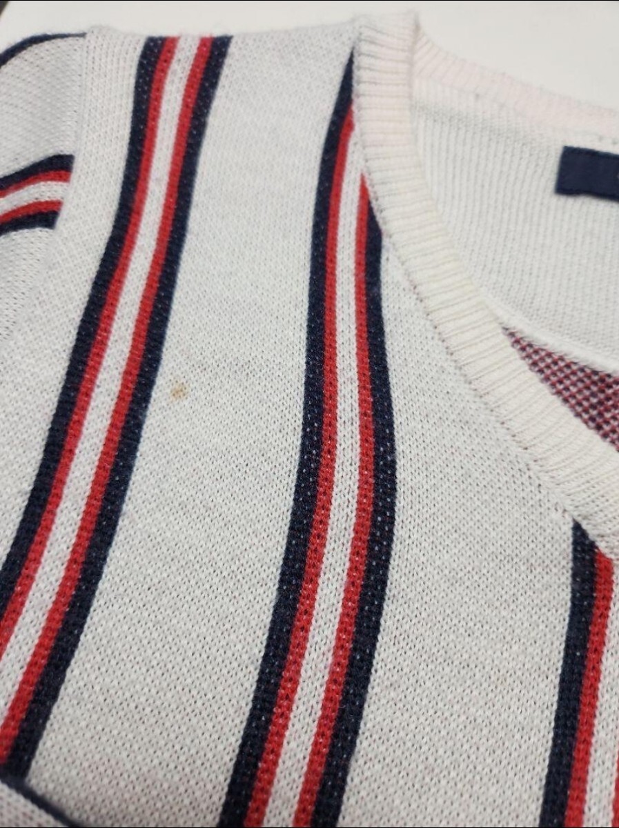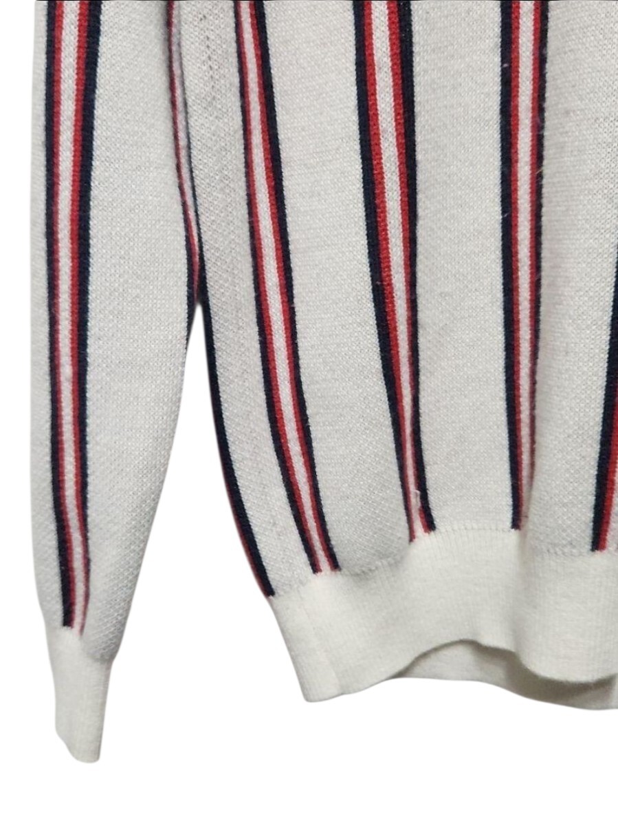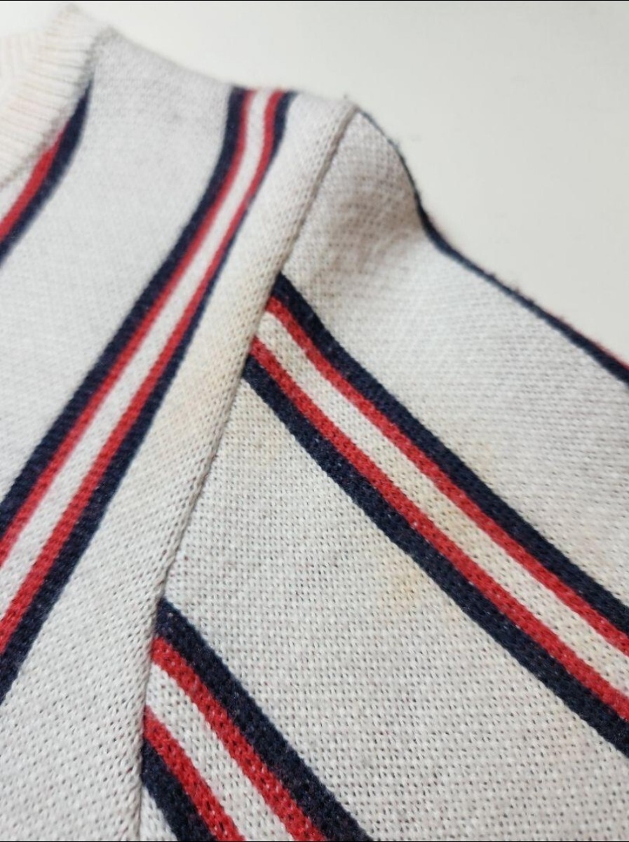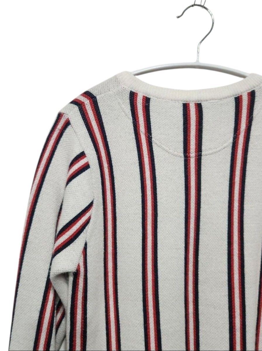 ホワイトベースにレッド×ブラックのマルチストライプ柄、胸元にブランドロゴ刺繍入り。