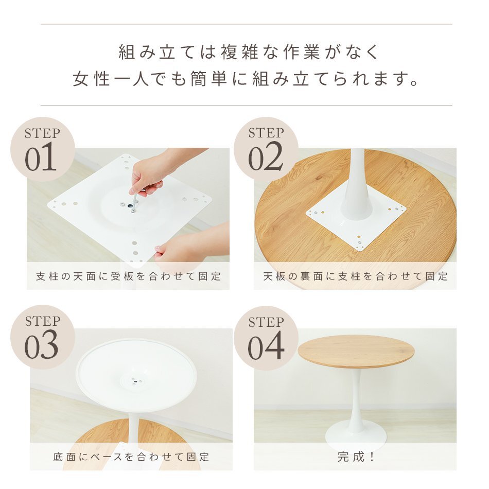 シンプルな形が美しい丸型ダイニングテーブル! シンプルだからこそ、どんなお部屋にも馴染みます。 ワンルームにもオススメ! お家にいながらおしゃれなカフェにいるかのような贅沢な時間を味わうことができます♪ 一本脚なので足元のスペースが広々。リラックスした姿勢で過ごせます。 耐久性にも優れ、頑丈なスチール脚はしっかりとテーブルを支えます。 脚裏には、滑り止めパーツ付き。床を傷つけることなく移動できます。 組立簡単!女性一人でも簡単に組み立てられます♪ 【商品仕様】 ・カラー:マーブルホワイト ・サイズ:(約)直径80×高さ74cm ・重量:(約)11.7kg ・耐荷重:(約)150kg ・素材:MDF/鉄/PE(滑り止め) 【注意事項】 ・直射日光又はストーブ等の熱は避けてご使用ください。 ・組立て説明書をよくお読みの上、正しく組立ててください。 ・加熱した鍋、湯沸かし器などを直接置かないでください。 |