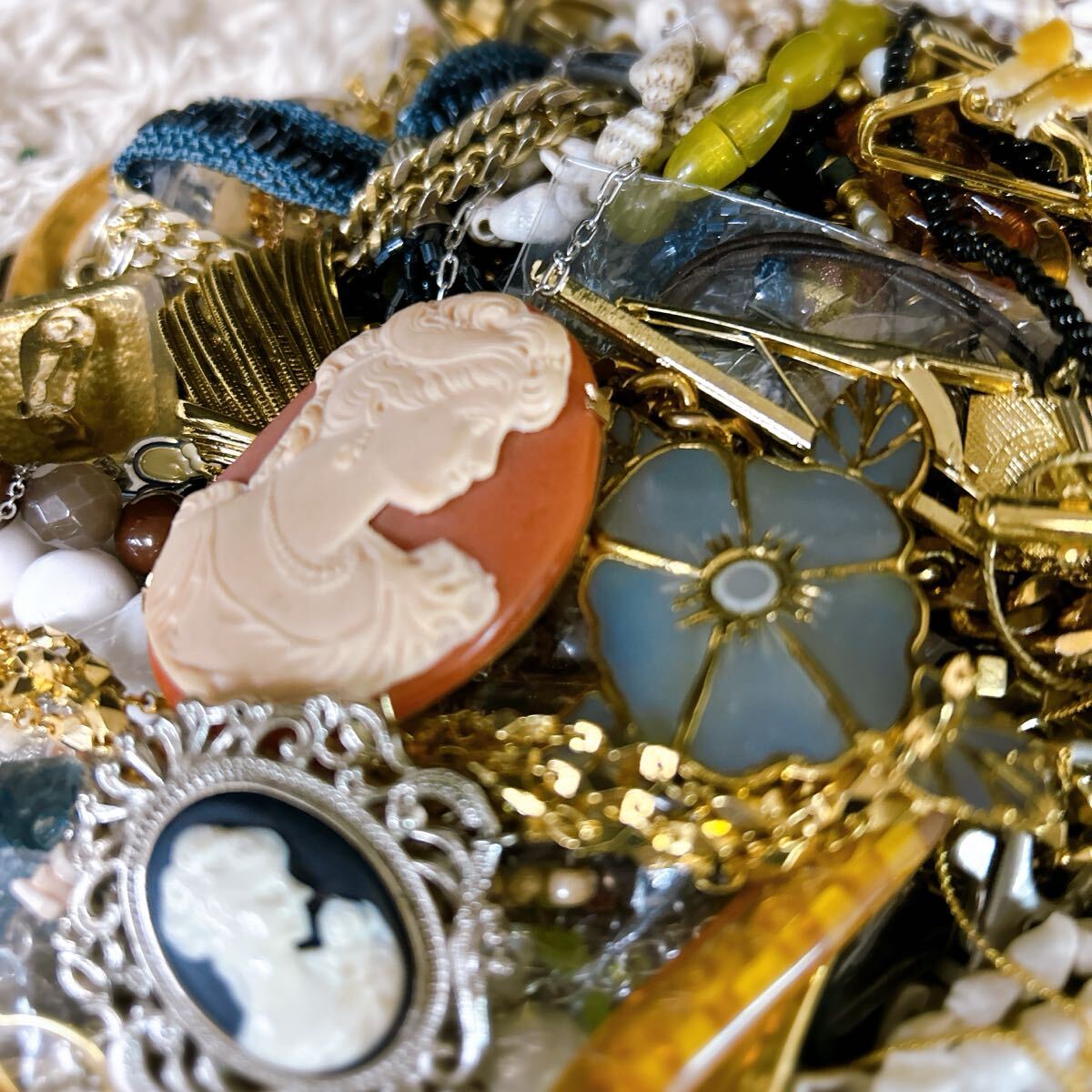 傷や擦れや欠けパーツ、絡みが酷い物、壊れているものもあります。ブローチの針などが出てしまう可能性がございますので開封時は十分に注意して行ってください。保証なし、ジャンク品扱いの出品となりますので、ご理解の上、ご入札ください。