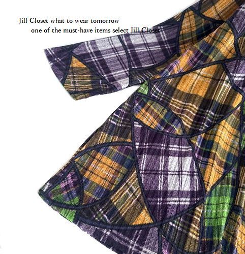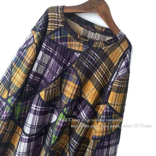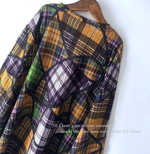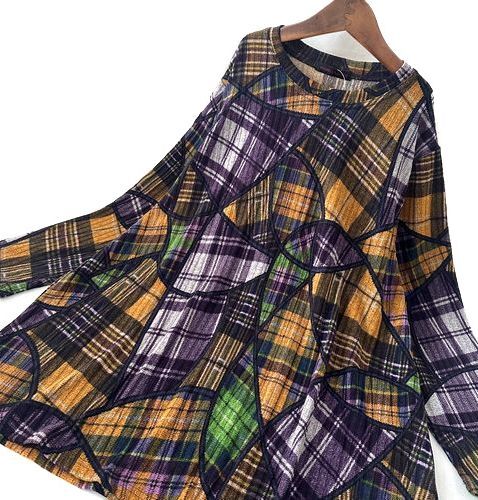 新品【送料185円】伸縮◎パッチワーク風&チェック柄*ランダム配色プリント*スタイルカバー◎ニットソー プルオーバーチュニック7702.OR
