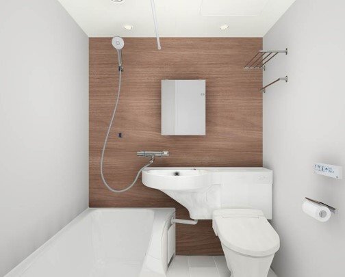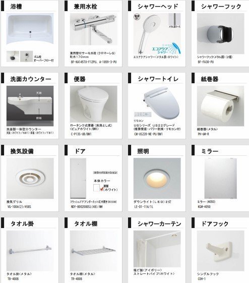 ◎LIXILホテル向け洗面・便器付ユニットバス[1216サイズ] BLCW-1216LBD+H 即決価格は、写真セット価格1.359.750円のなんと 69%OFFで 463.674円【消費税込】 ◆据付必要寸法1310×1680×2494㎜。 ◆洗面器・便器付きユニットバスです。 ◆バスルームの魅力をアップするアクセントパネルは、光沢のウォールナットで豪華な雰囲気に。 ◆洗面カウンター一体で、豪華で清掃性もアップ。 ◆浴槽と洗い場床が分割構造、ラクに搬入・ラクに施工。 ◆低床設置で、浴室への出入りがしやすい、浴室入口段差50㎜。 ◆浴槽への出入りがしやすい、またぎ高さは約450㎜。 ◆兼用壁付け水栓は、温度調整がしやすいサーモ機能付き水栓にエコアクアシャワー。 ◆お手入れのしやすさに配慮した、シャーワートイレが付きました。 ◆照明は、ダウンライト照明(LED2灯) ◆『フラッシュドア』アンダーカット式。外開き。 ◆ドア位置は4通り(RL・RC・LR・LC)から選択できます。 ◆天井換気扇は付いていません。 | |